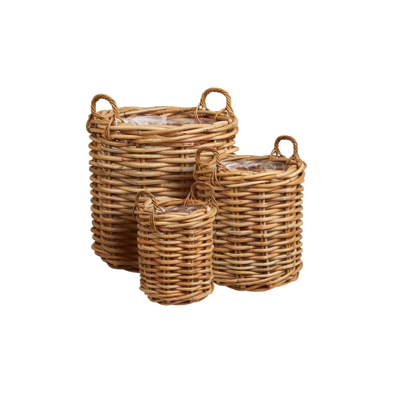ZESTAW KOSZY DEKORACYJNYCH KUTA RATTAN - 3 sztuki. Kuta kosze dekoracyjne - kosz dekoracyjny, z plastikową folią w środku, Zestaw stanowią 3 sztuki. U duńskiego producenta HOUSE NORDIC występuje dużo rodzajów plecionych koszy czy doniczek o różnych o kształtach, kolorach i wymiarach - patrz produkty powiązane.