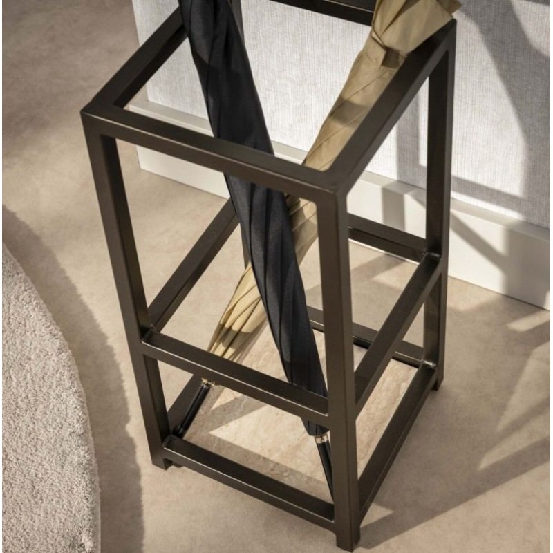 Stojak na parasole BADDY to stylowy i funkcjonalny element wyposażenia, który dzięki swojej wyjątkowej formie przyciąga uwagę i dodaje wnętrzu elegancji oraz nowoczesnego charakteru. Stabilna, metalowa konstrukcja o kwadratowej formie została wykończona w brązowym odcieniu, który doskonale wpisuje się w nowoczesne i klasyczne wnętrza. Uzupełnieniem całości jest praktyczna podstawa zbierająca wodę o wyglądzie beżowego trawertynu, która skutecznie gromadzi odciekającą wodę, chroniąc podłogę i pomagając w szybkim osuszaniu parasoli. Stojak ten wyróżnia się półotwartą formą, która łączy w sobie funkcjonalność i praktyczność. Dzięki solidnemu metalowemu wykonaniu mebel jest stabilny, trwały i łatwy w utrzymaniu czystości. Ten elegancki stojak na parasole doskonale sprawdzi się w poczekalni, salonie, przedpokoju czy biurze, wprowadzając do przestrzeni nowoczesny styl, czyniąc go nie tylko praktycznym dodatkiem, ale również efektowną dekoracją, która podkreśli charakter każdego wnętrza.