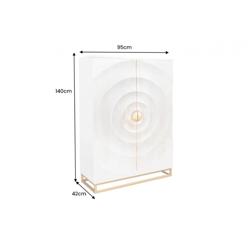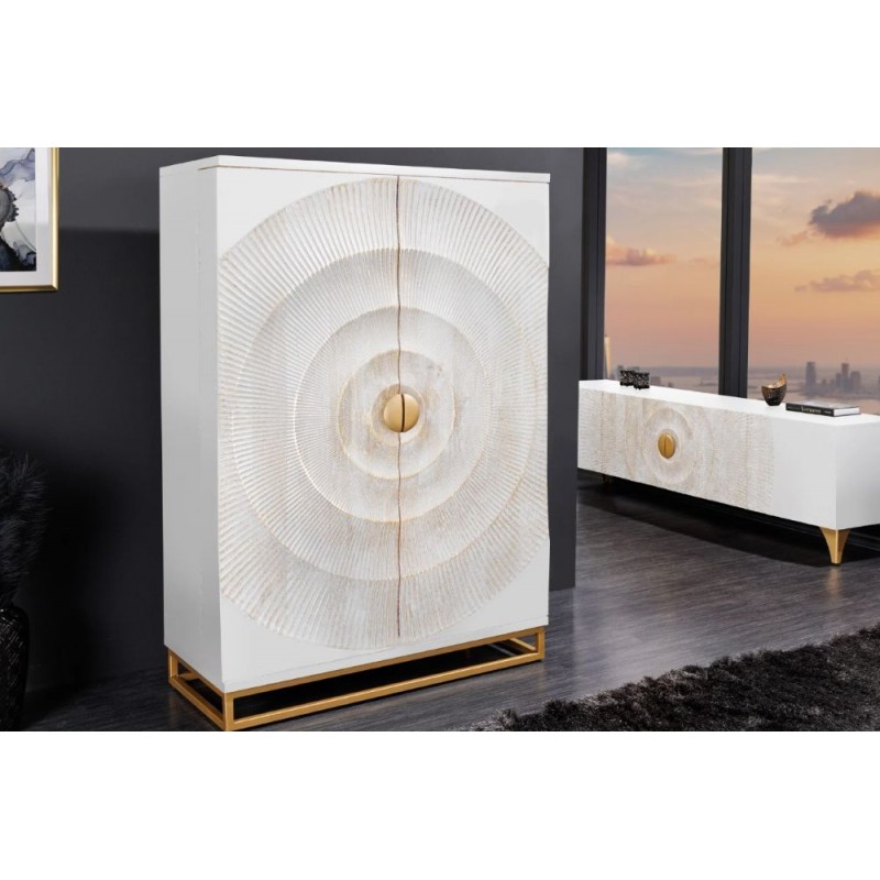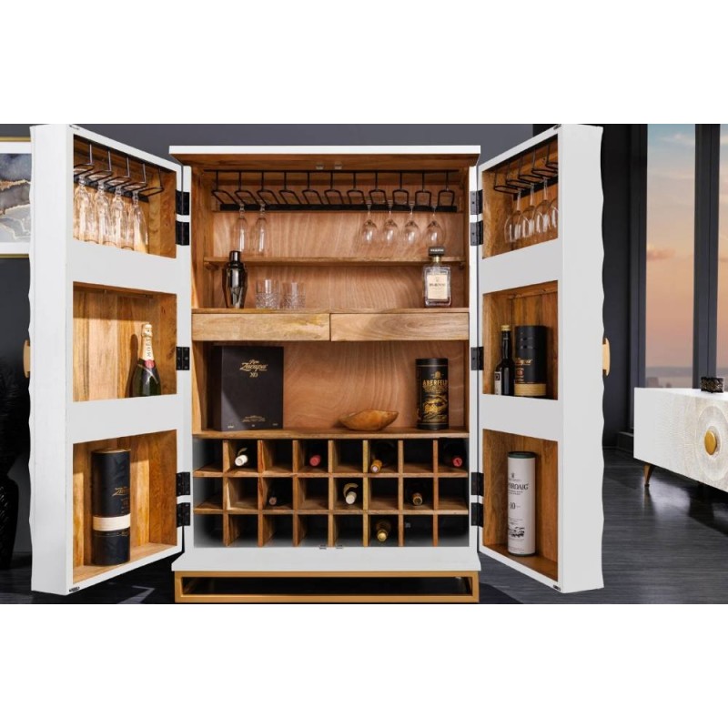 Barek GOLDEN SUNSET to mebel o bardzo eleganckim wyglądzie, który idealnie doda Twojemu salonowi niesamowitego uroku. Został zaprojektowany i wykonany w całości z litego drewna mango o barwie białej i osadzony na stabilnej metalowej podstawie w kolorze złotym. Bez wątpienia elementem robiącym największe wrażenie są duże frontowe drzwiczki ręcznie robione z unikatowym geometrycznym poprzecieranym zdobieniem, dzięki któremu całość prezentuje się fenomenalnie i nadaje meblowi oryginalnego charakteru. Połączenie funkcjonalności i praktyczności sprawi, że każda butelka wina znajdzie w nim swoje miejsce. Barek ten został wykonany z duża precyzją z drewna mango w kolorze białym, który dzięki zachowaniu oryginalności słojów i sęków nadaje jej wyjątkowy wygląd. Głównym atutem mebla jest duża pojemność przechowywania oraz wiele miejsc idealnie przystosowanych do przetrzymywania alkoholi, różnego rodzaju zastaw oraz kieliszków. Barek jest wykonany z największą dokładnością, co można zauważyć dzięki dbałości o każdy detal i wykorzystaniu każdej możliwej przestrzeni mebla, aby stał się on w pełni funkcjonalny i bez problemu pomieścił wszystkie niezbędne akcesoria potrzebne do serwowania trunków. Idealnie odzwierciedla styl nowoczesny, a swoje zastosowanie znajdzie zarówno w dużej przestronnej jadalni jak i salonie, gdzie stanie się nie tylko funkcjonalnym meblem, ale także przepiękną dekoracją.