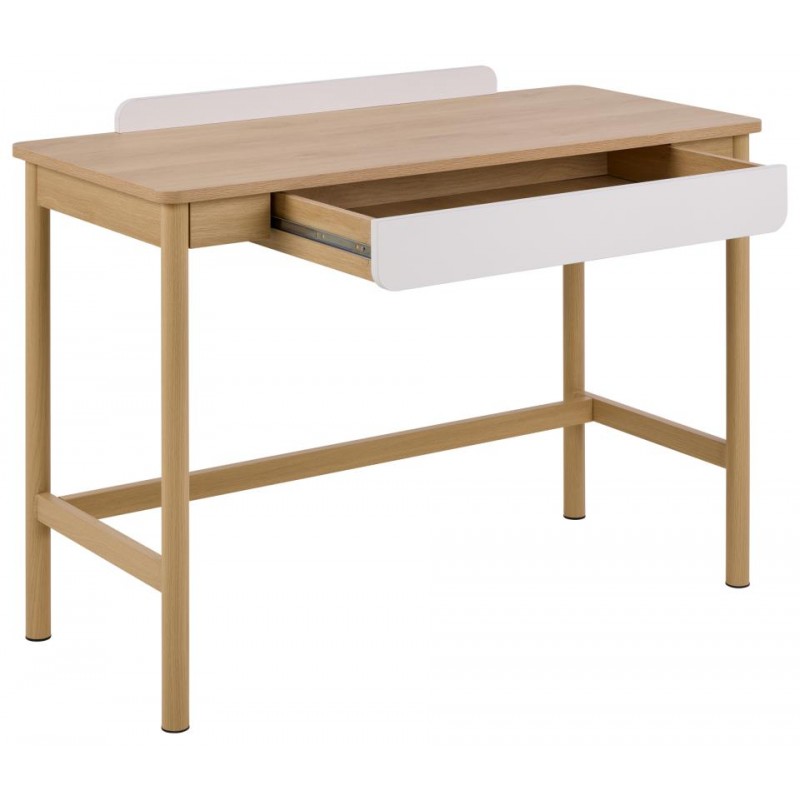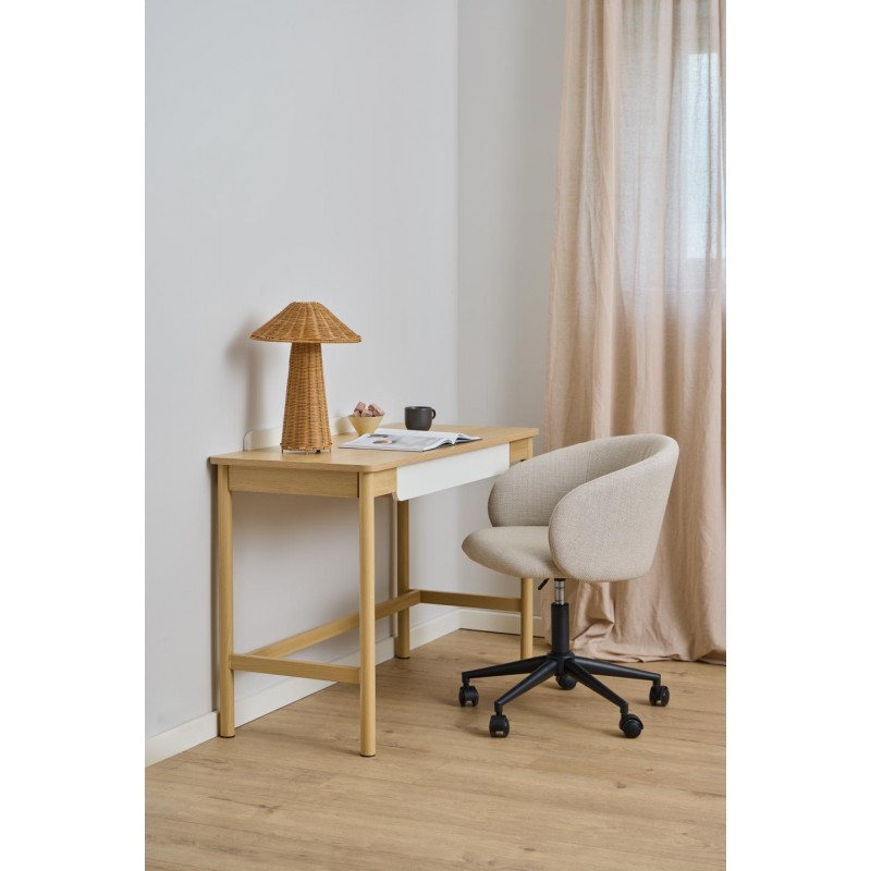 Biurko Alpena stanowi doskonały wybór zarówno do biura jak i pokoju młodzieżowego. Mebel ten reprezentuje nowoczesny styl skandynawski — łączy w sobie naturalny, drewniany wygląd z beżowymi akcentami i delikatnie zaokrąglonymi kształtami, dzięki czemu harmonijnie dopasowuje się do różnych aranżacji wnętrz. Przestronna beżowa szuflada zapewnia wygodne miejsce do przechowywania najpotrzebniejszych przedmiotów.