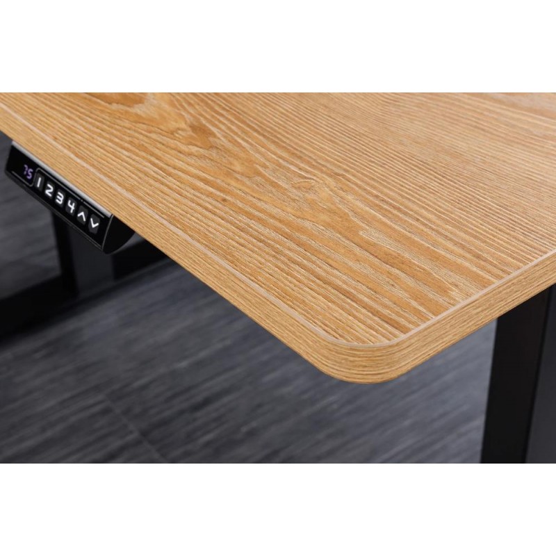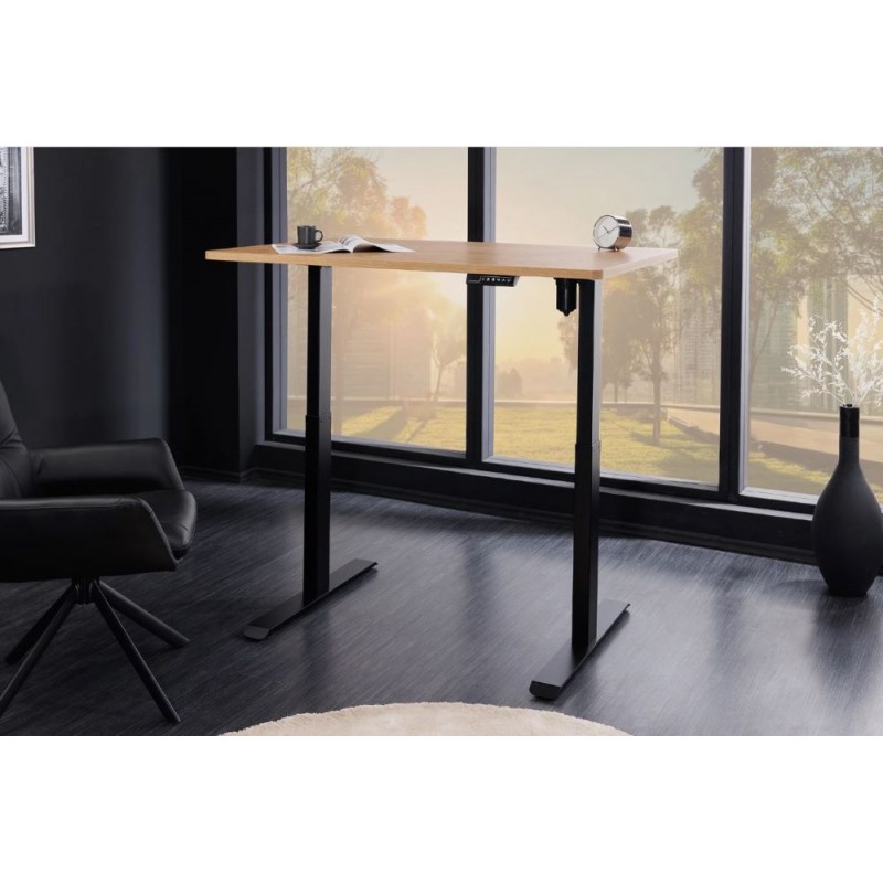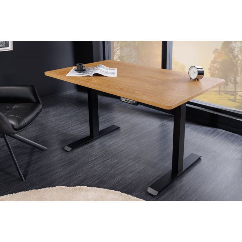 Biurko OAK to wyjątkowa propozycja dla tych, którzy cenią połączenie stylowego designu z nowoczesną funkcjonalnością. Wyposażone w system regulacji wysokości, pozwala na łatwe dostosowanie pozycji blatu do indywidualnych preferencji, zarówno w pracy siedzącej, jak i stojącej. Blat biurka został wykonany z płyty MDF z dekorem drewnianym w postaci imitacji drewna dębowego w jego naturalnym kolorze, na którym została zachowana oryginalna struktura drewna w postaci sęków i słojów, dzięki czemu prezentuje się zjawiskowo. Osadzono go na czarnej, metalowej podstawie z możliwością swobodnego dostosowania poziomu blatu, która nie tylko gwarantuje stabilność, ale również wprowadza surowe naturalne wykończenie. Kluczową zaletą mebla jest jego ergonomiczna funkcjonalność regulacji wysokości, która znacząco wpływa na komfort codziennej pracy. To idealny wybór do wnętrz utrzymanych w stylu loftowym, minimalistycznym czy industrialnym, a jego surowa zarazem elegancka forma doskonale dopełni przestrzeń nowoczesnego biura.