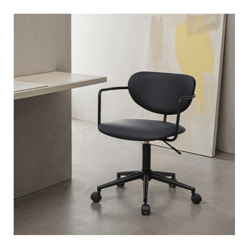 KRZESŁO BIUROWE OBROTOWE OWEN Nadaj swojemu kącikowi roboczemu nowy blask dzięki temu ekspresyjnemu krzesłu biurowemu z regulacją wysokości. Połączone dwiema czarnymi stalowymi rurami siedzisko i oparcie mają wygięty dębowy lakierowany fornir, który jest wykończony warstwą pianki i czarnej sztucznej skóry dla większego komfortu. Pięcioramienna podstawa...