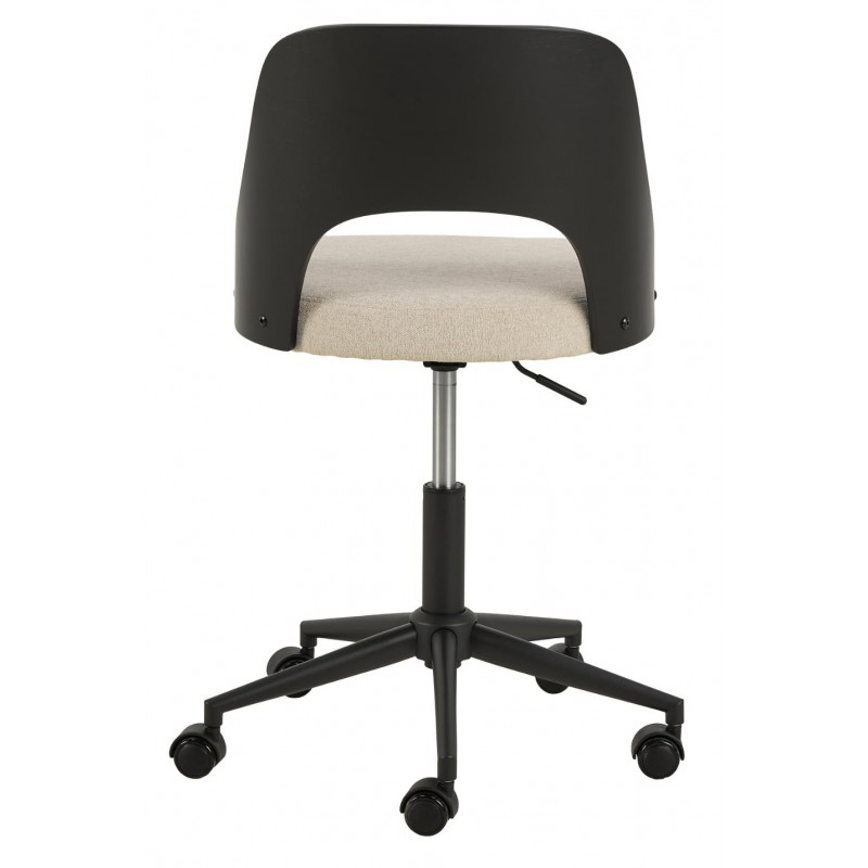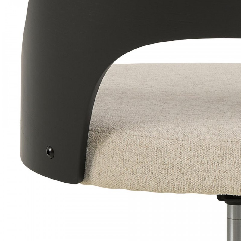 Krzesło biurowe z regulacją wysokości łączy styl i funkcjonalność. Czarny, lakierowany dębowy fornir w oparciu przyciąga uwagę subtelnym wyciętym detalem, natomiast siedzisko obite beżową tkaniną przypominającą szenilę zachwyca miękkością i przyjemną w dotyku strukturą. Stabilność i wygodę użytkowania zapewnia czarna, pięcioramienna podstawa obrotowa z kółkami hamulcowymi, które umożliwiają swobodne poruszanie się w każdym kierunku.
