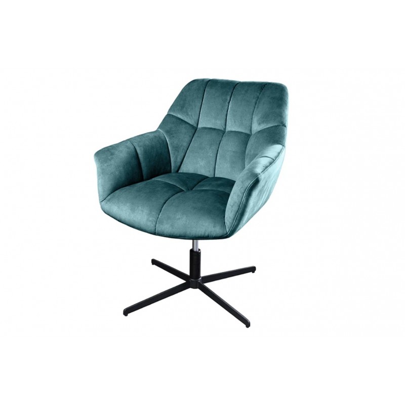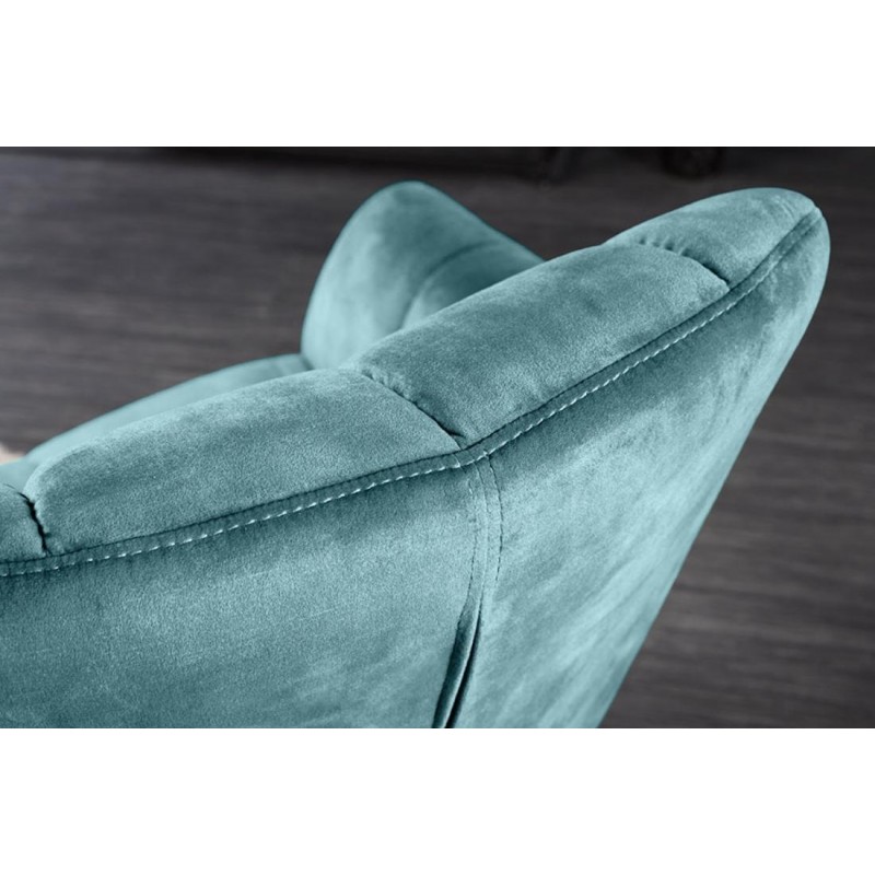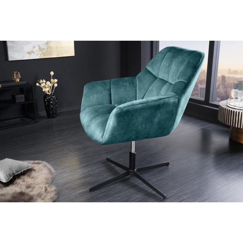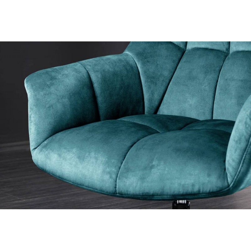 Nowoczesny fotel PAPILLON to funkcjonalne i stylowe rozwiązanie, które doskonale odnajdzie się zarówno w eleganckim biurze jak i w salonie. Jego siedzisko wykonano z modnej aksamitnej tkaniny w kolorze turkusowym, wyróżniając się pięknym i starannym wykończeniem wewnątrz mebla. Ozdobne pionowe i poziome przeszycia oraz stylowe pikowania nadają mu wyjątkowej elegancji, czyniąc go prawdziwą ozdobą każdego wnętrza. Stabilna, metalowa podstawa w czarnym kolorze umożliwia obrót, co dodatkowo podkreśla praktyczny jego charakter. Nowoczesny design podkreślają oryginalne linie, subtelne zdobienia oraz smukła czarna podstawa, harmonijnie łączy się z wygodnym siedziskiem oraz odpowiednio wyprofilowanym oparciem. PAPILLON, został wykonany z materiałów najwyższej jakości, zapewniając przy tym wyjątkowy komfort siedzenia oraz ekskluzywny wygląd. Dzięki ergonomicznemu oparciu i siedzisku doskonale wspiera sylwetkę podczas jego użytkowania. Model ten idealnie wpasuje się w nowoczesne aranżacje, dodając pomieszczeniom nie tylko elegancji i funkcjonalności, ale także odrobinę luksusu.