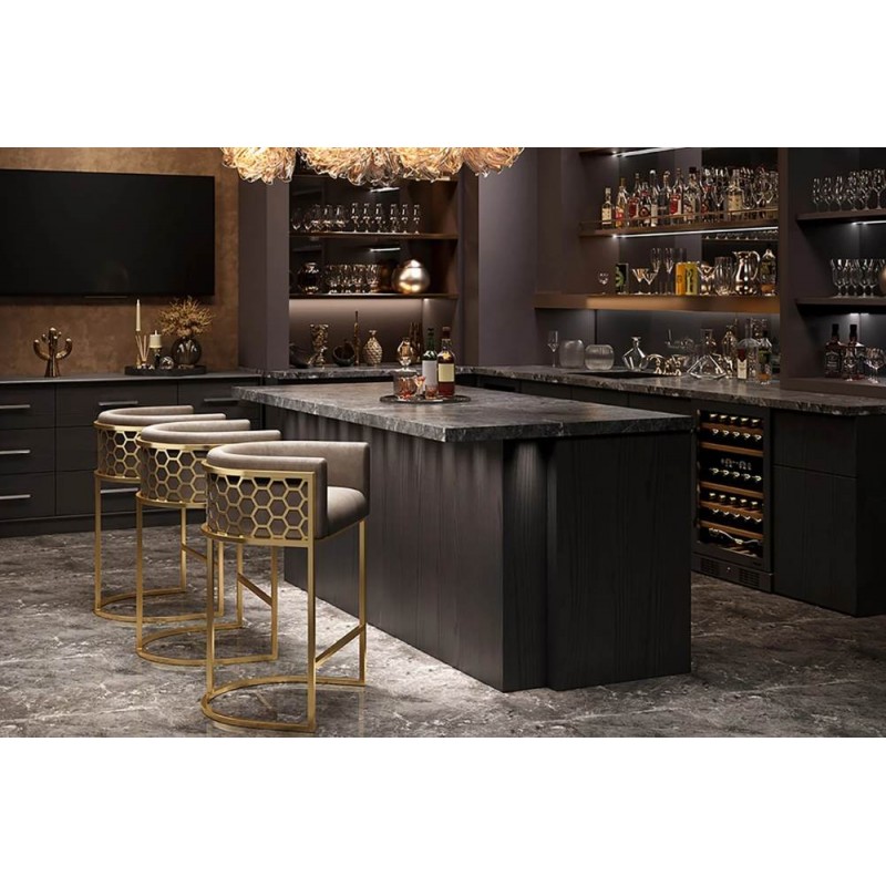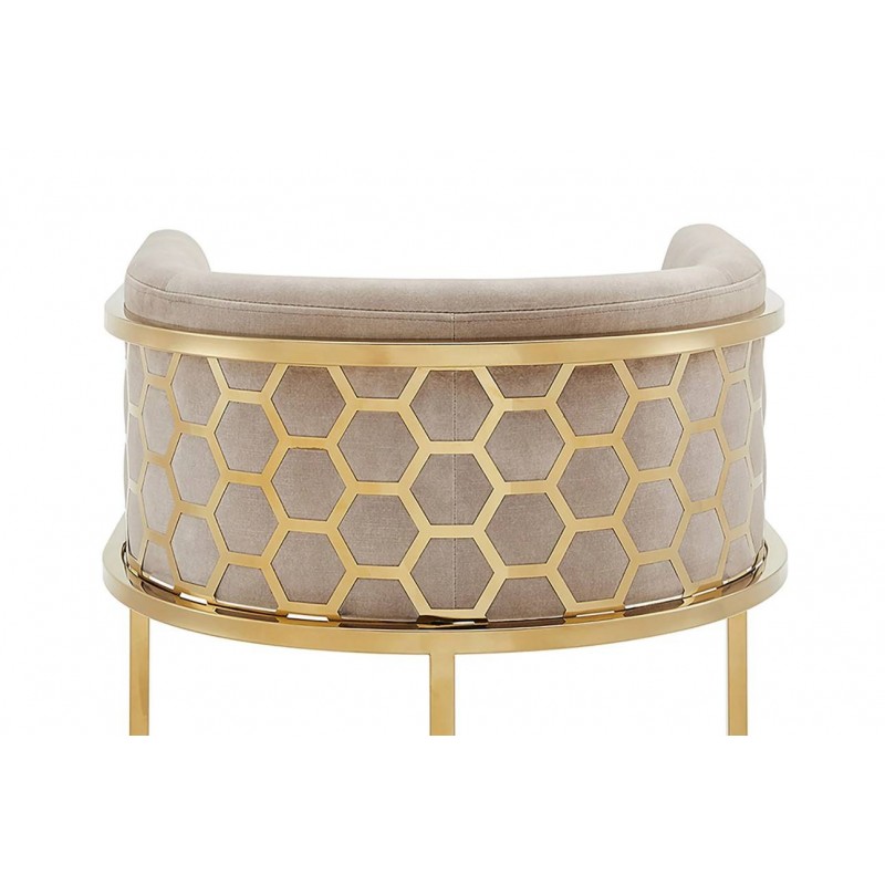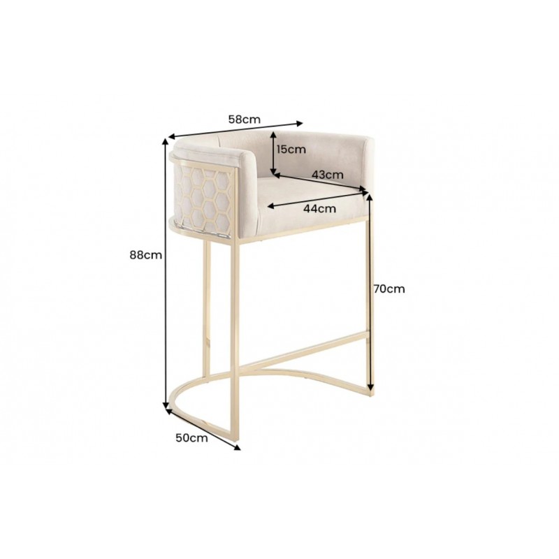 Elegancki hoker ELEGANCE to bez wątpienia połączenie komfortu, nowoczesnego designu i wysokiej jakości wykonania. Siedzisko otapicerowano modną aksamitną tkaniną w kolorze beżowym, które zostało osadzone na stabilnej podstawie ze stali nierdzewnej, gwarantując tym samym trwałość i solidność mebla. Kształt mebla zapewnia wyjątkową wygodę, a wyprofilowane oparcie odpowiednio wspiera sylwetkę podczas jego użytkowania. Złota metalowa konstrukcja nie tylko podkreśla jego wyjątkowość, ale dzięki geometrycznym detalom wokół siedziska wyróżnia jego design. Dodatkowo poziome podparcie dla nóg zwiększa komfort siedzenia przy wysokim blacie, a oryginalne krzywizny i subtelne zdobienia nadają mu niepowtarzalnego charakteru. Hoker ELEGANCE został stworzony z myślą o osobach ceniących funkcjonalność oraz luksusowe, stylowe wykończenie wnętrz. Charakterystyczną cechą mebla jest aksamitna tkanina, która w połączeniu ze złotą podstawą podkreśla jego stylowy wygląd idealnie komponując się z nowoczesnymi wnętrzami w stylu glamour.
