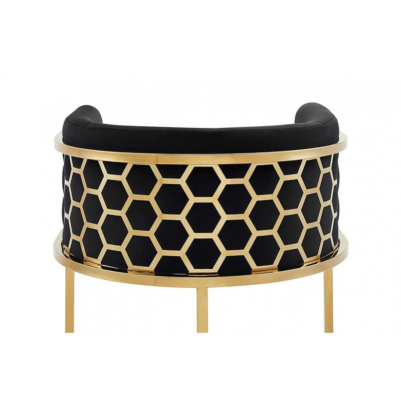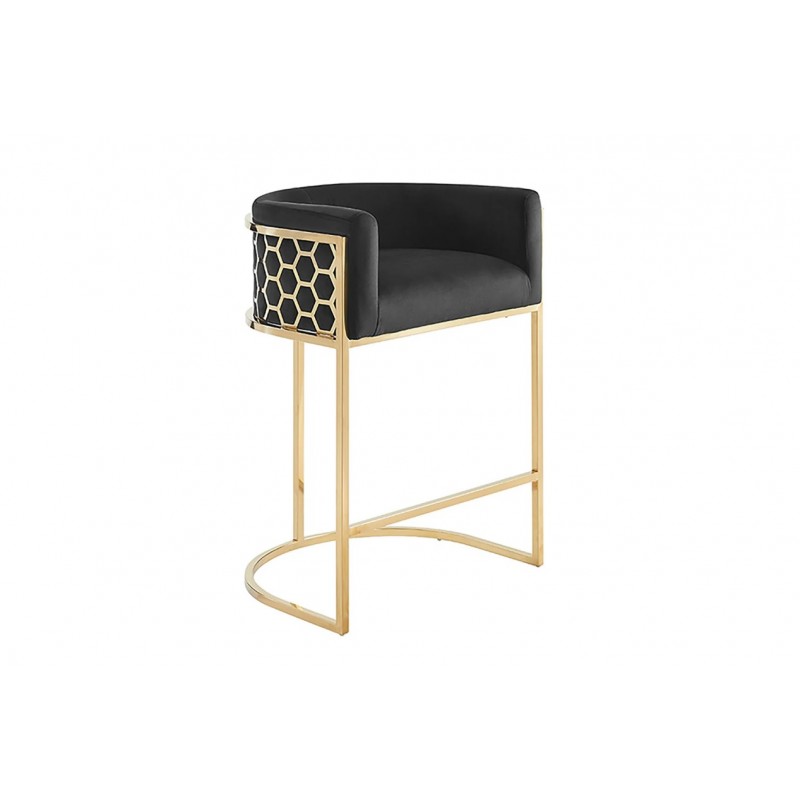 Elegancki hoker ELEGANCE to bez wątpienia połączenie komfortu, nowoczesnego designu i wysokiej jakości wykonania. Siedzisko otapicerowano modną aksamitną tkaniną w kolorze czarnym, które zostało osadzone na stabilnej podstawie ze stali nierdzewnej, gwarantując tym samym trwałość i solidność mebla. Kształt mebla zapewnia wyjątkową wygodę, a wyprofilowane oparcie odpowiednio wspiera sylwetkę podczas jego użytkowania. Złota metalowa konstrukcja nie tylko podkreśla jego wyjątkowość, ale dzięki geometrycznym detalom wokół siedziska wyróżnia jego design. Dodatkowo poziome podparcie dla nóg zwiększa komfort siedzenia przy wysokim blacie, a oryginalne krzywizny i subtelne zdobienia nadają mu niepowtarzalnego charakteru. Hoker ELEGANCE został stworzony z myślą o osobach ceniących funkcjonalność oraz luksusowe, stylowe wykończenie wnętrz. Charakterystyczną cechą mebla jest aksamitna tkanina, która w połączeniu ze złotą podstawą podkreśla jego stylowy wygląd idealnie komponując się z nowoczesnymi wnętrzami w stylu glamour.