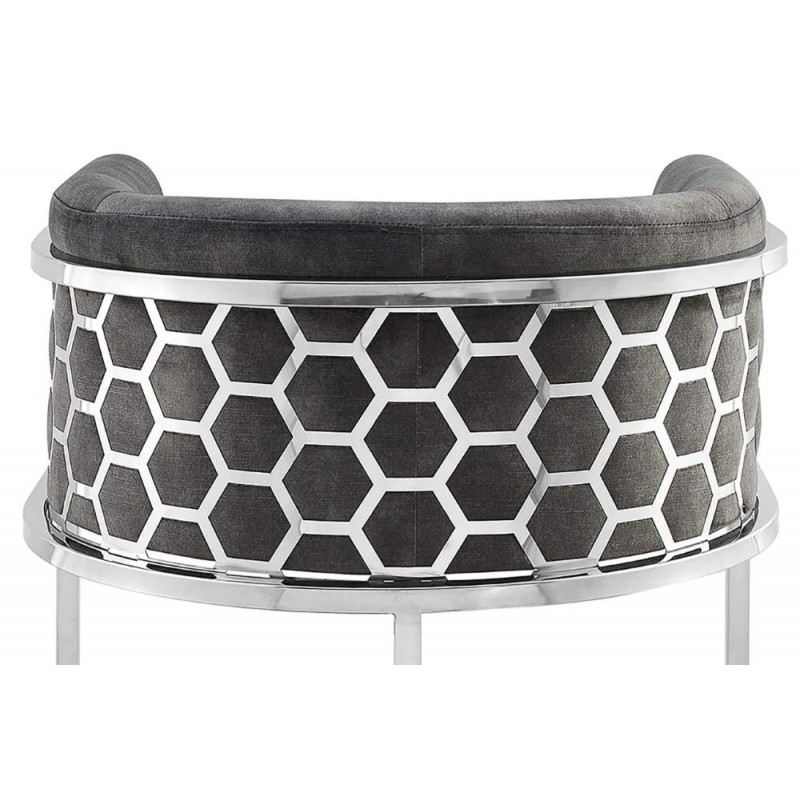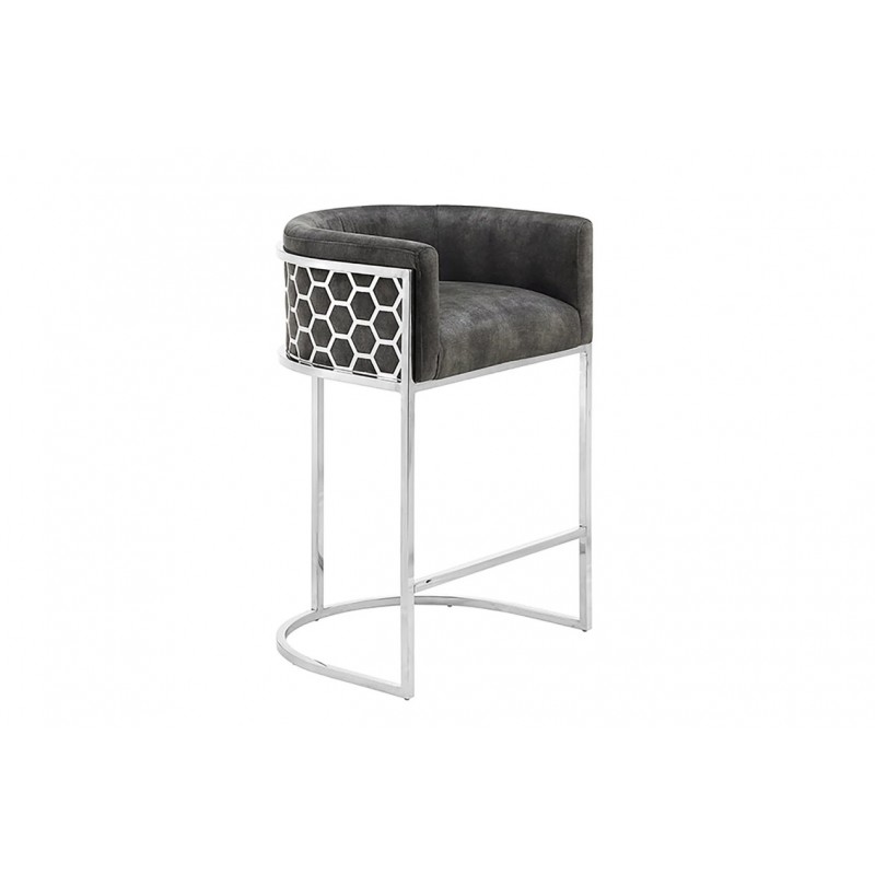 Elegancki hoker ELEGANCE to bez wątpienia połączenie komfortu, nowoczesnego designu i wysokiej jakości wykonania. Siedzisko otapicerowano modną aksamitną tkaniną w kolorze szarym, które zostało osadzone na stabilnej podstawie ze stali nierdzewnej, gwarantując tym samym trwałość i solidność mebla. Kształt mebla zapewnia wyjątkową wygodę, a wyprofilowane oparcie odpowiednio wspiera sylwetkę podczas jego użytkowania. Srebrna metalowa konstrukcja nie tylko podkreśla jego wyjątkowość, ale dzięki geometrycznym detalom wokół siedziska wyróżnia jego design. Dodatkowo poziome podparcie dla nóg zwiększa komfort siedzenia przy wysokim blacie, a oryginalne krzywizny i subtelne zdobienia nadają mu niepowtarzalnego charakteru. Hoker ELEGANCE został stworzony z myślą o osobach ceniących funkcjonalność oraz luksusowe, stylowe wykończenie wnętrz. Charakterystyczną cechą mebla jest aksamitna tkanina, która w połączeniu ze srebrną podstawą podkreśla jego stylowy wygląd idealnie komponując się z nowoczesnymi wnętrzami.