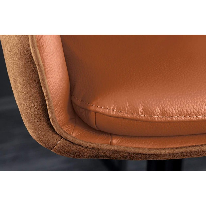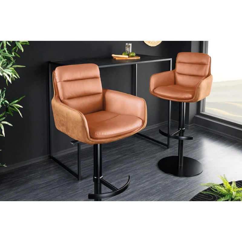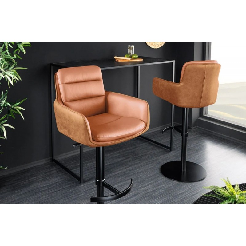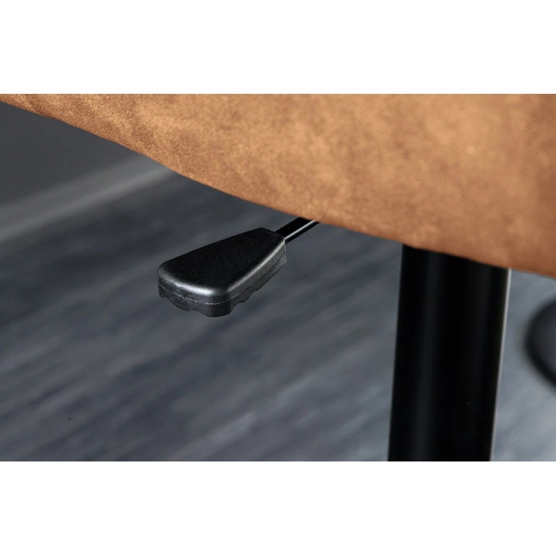 Nowoczesny hoker BIG GEORGE w wersji z designerskim oparciem oraz siedziskiem posiada wiele korzyści w jednym produkcie, który bez wątpienia zachwyci swoim starannym wykończeniem. Wygodne zaokrąglone siedzisko utrzymane w tonacji brandy idealnie współgra z obrotową czarną metalową podstawą. Wykonano go z podwójnej tkaniny na zewnątrz użyto modnej tkaniny z mikrofibry, natomiast jego wnętrze zdobi skóra w odcieniach brązu. Zastosowanie na siedzisku oraz oparciu dekoracyjnych przeszyć nadaje mu niesamowitej nowoczesności. Mebel ten wyróżnia się przede wszystkim swoją oryginalną formą oraz bardzo ciekawym wyglądem. Jego oparcie jest jego ważnym elementem, ponieważ jest idealnie wyprofilowane aby wesprzeć i odciążyć sylwetkę siedzącego podczas jego użytkowania, a podparcie dla nóg poprawia komfort siedzenia przy wysokim blacie. Hokery poza swoją funkcjonalnością dodają wnętrzom wyjątkowego stylu sprawiając, że pomieszczenie nabiera nowoczesnego charakteru. Modny kolor brązu i uniwersalny czarny kolor podstawy to kompozycja, która idealnie sprawdza się we wnętrzach urządzonych zarówno w stylu industrialnym jak i nowoczesnym dodając przestrzeni niezwykle oryginalnego charakteru.