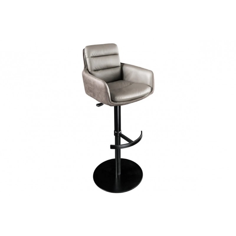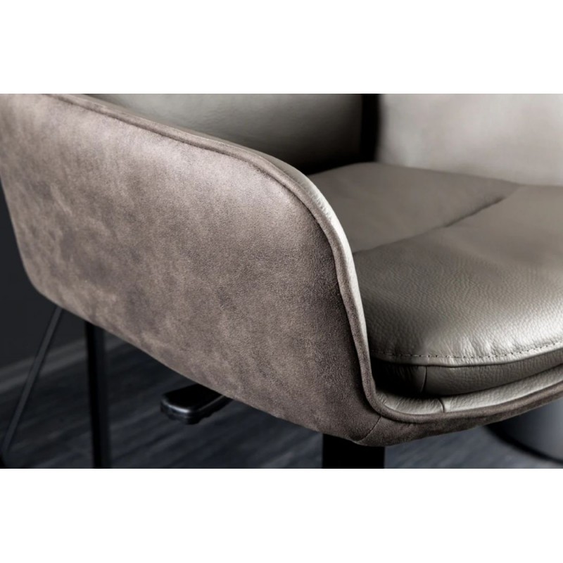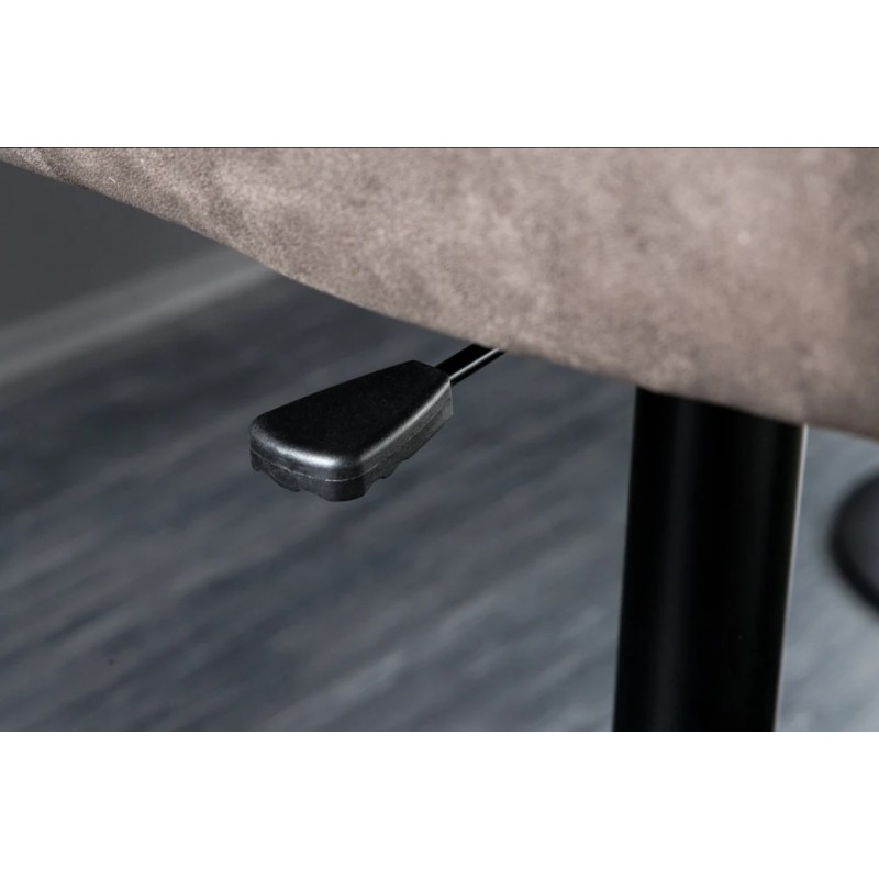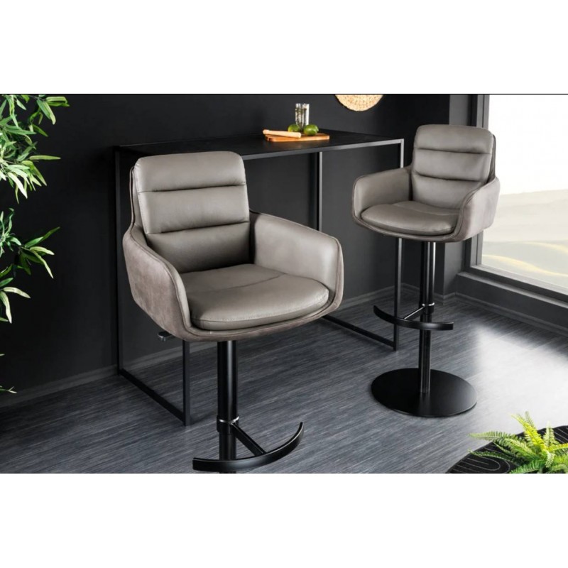 Nowoczesny hoker BIG GEORGE w wersji z designerskim oparciem oraz siedziskiem posiada wiele korzyści w jednym produkcie, który bez wątpienia zachwyci swoim starannym wykończeniem. Wygodne zaokrąglone siedzisko utrzymane w brązowoszarej tonacji idealnie współgra z obrotową czarną metalową podstawą. Wykonano go z podwójnej tkaniny na zewnątrz użyto modnej tkaniny z mikrofibry, natomiast jego wnętrze zdobi skóra w odcieniach brązu. Zastosowanie na siedzisku oraz oparciu dekoracyjnych przeszyć nadaje mu niesamowitej nowoczesności. Mebel ten wyróżnia się przede wszystkim swoją oryginalną formą oraz bardzo ciekawym wyglądem. Jego oparcie jest jego ważnym elementem, ponieważ jest idealnie wyprofilowane aby wesprzeć i odciążyć sylwetkę siedzącego podczas jego użytkowania, a podparcie dla nóg poprawia komfort siedzenia przy wysokim blacie. Hokery poza swoją funkcjonalnością dodają wnętrzom wyjątkowego stylu sprawiając, że pomieszczenie nabiera nowoczesnego charakteru. Modny kolor taupe i uniwersalny czarny kolor podstawy to kompozycja, która idealnie sprawdza się we wnętrzach urządzonych zarówno w stylu industrialnym jak i nowoczesnym dodając przestrzeni niezwykle oryginalnego charakteru.