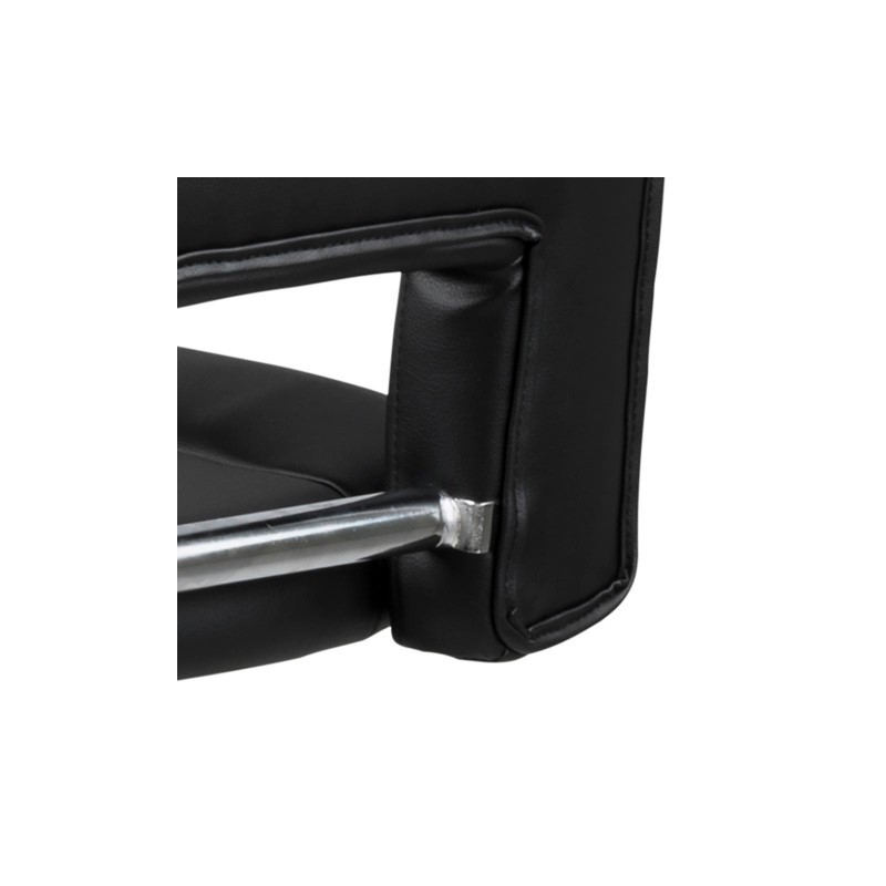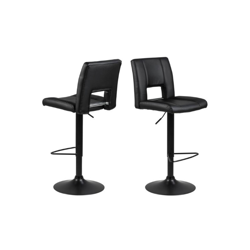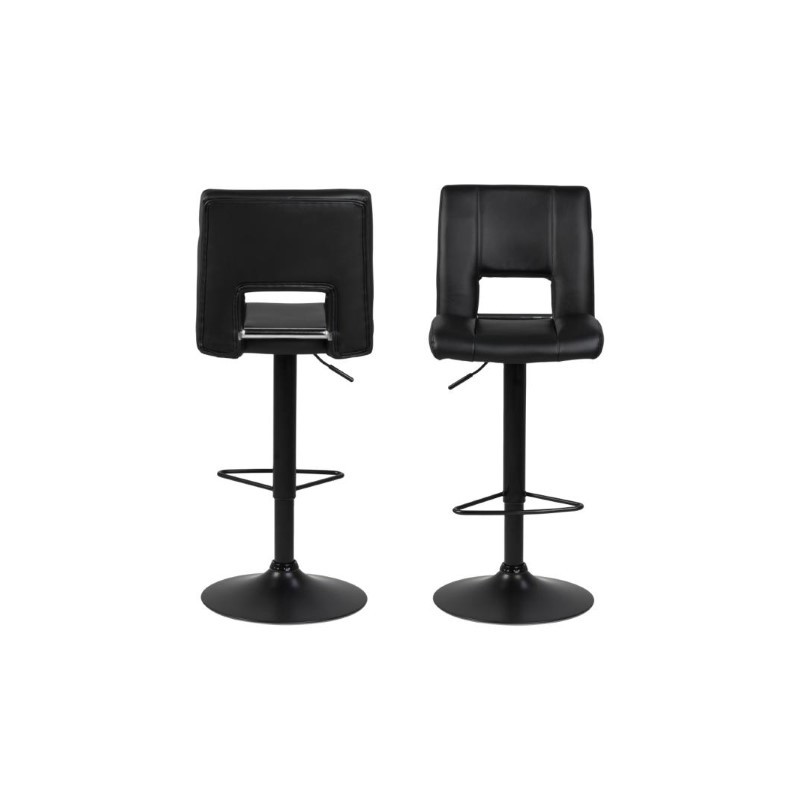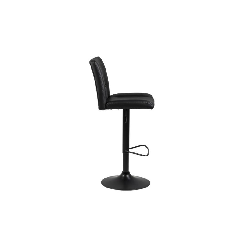 Krzesło barowe z wygodnym oparciem pokryty został czarną ekoskórą i wykończony czarną, metalową podstawą z regulacją wysokości siedziska.