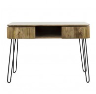 BIURKO ANGUS 110X50 CM DZIKI DĄB Biurko dla ucznia lub studenta wykonane w skandynawskim stylu, sprawdzi się podczas codziennej pracy, nauki lub w trakcie korzystania z laptopa. Blat biurka wykonany został z okleiny w kolorze dzikiego dębu oraz podstawy metalowej. W biurku umieszczona została półka oraz drzwi przesuwne. Biurko występuje również w kolorze...