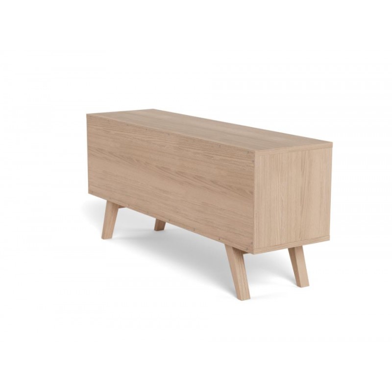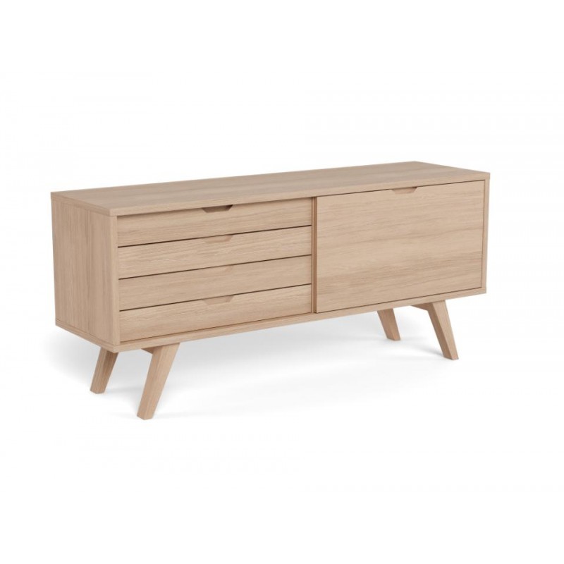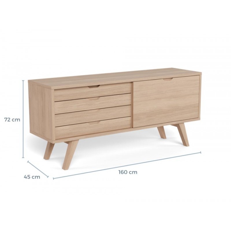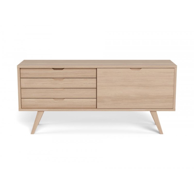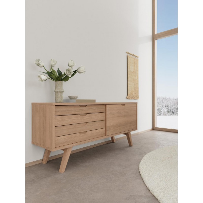 Ten nowoczesny mebel o prostej formie łączy w sobie styl i funkcjonalność. Komoda wykonana w stylu skandynawskim, prezentuje się nowocześnie i stylowo. Wykonany jest z białego forniru dębowego i ma grubą ramę oraz nogi, które nadają mu solidny wygląd. Cztery szuflady i półka ukryta za przesuwanymi drzwiczkami ułatwiają organizację. Mebel z pewnością znajdzie zastosowanie w wielu salonach.