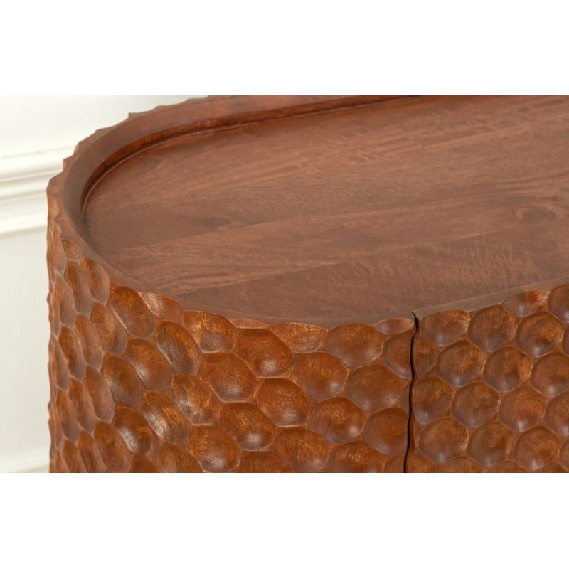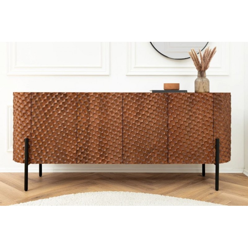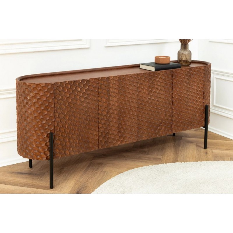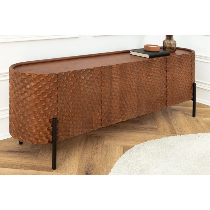 Owalna, elegancka komoda ADLON to mebel, który doskonale odnajdzie się zarówno w klasycznym, jak i minimalistycznym, nowoczesnym wnętrzu. Wykonana z litego drewna mango, zachwyca frontem zdobionym efektowną dekoracją 3D w kształcie plastra miodu w odcieniu ciepłego brązu. Stabilną podstawę tworzy czarna metalowa konstrukcja, która nadaje całości lekkości i nowoczesnego charakteru. Wyposażona jest w dwie podwójne pojemne półki, które bez problemu zdołają pomieścić rzeczy codziennego użytku, książki czy zastawę stołową, oferując tym samym dużą powierzchnię do przechowywania. Dzięki temu mebel łączy w sobie funkcjonalność, wytrzymałość i łatwość pielęgnacji. Ponadto wykonana jest niewątpliwie z dużą precyzją, dzięki zachowaniu i odwzorcowaniu naturalnej oryginalności zarówno słojów jak i sęków. Smukła linia oraz harmonijne połączenie brązowego drewna z czarną podstawą sprawiają, że mebel prezentuje się niezwykle elegancko i ponadczasowo. Komoda ADLON sprawdzi się znakomicie w każdym nowoczesnym salonie, gdzie stanie się nie tylko funkcjonalnym meblem, ale także przepiękną dekoracją.