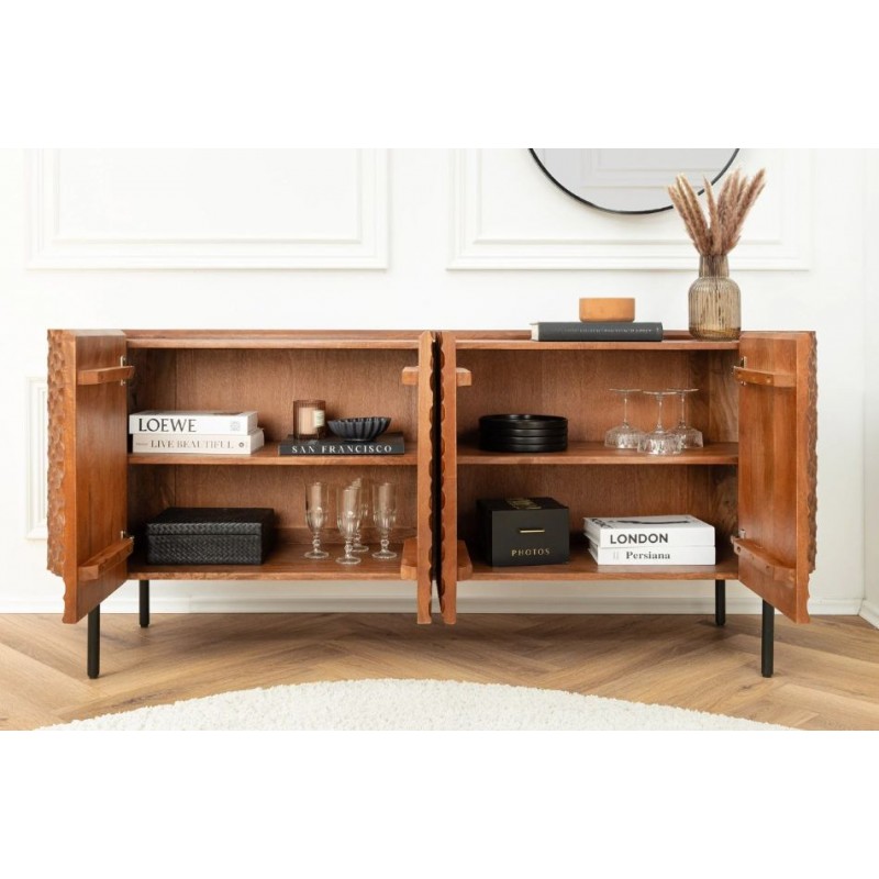 KOMODA SCORPION 140X38 CM MANGO CZARNY Komoda Scorpion to mebel wykonany z drewna mango. Posiada pojemne półki, które pomieszczą książki oraz zastawę stołową. Przepiękne żłobienia na drzwiach frontowych niewątpliwie stanowią ciekawy, nietuzinkowy design. Wykonana z dużą precyzją będzie wspaniałym dodatkiem do każdego nowoczesnego jak i klasycznego...
