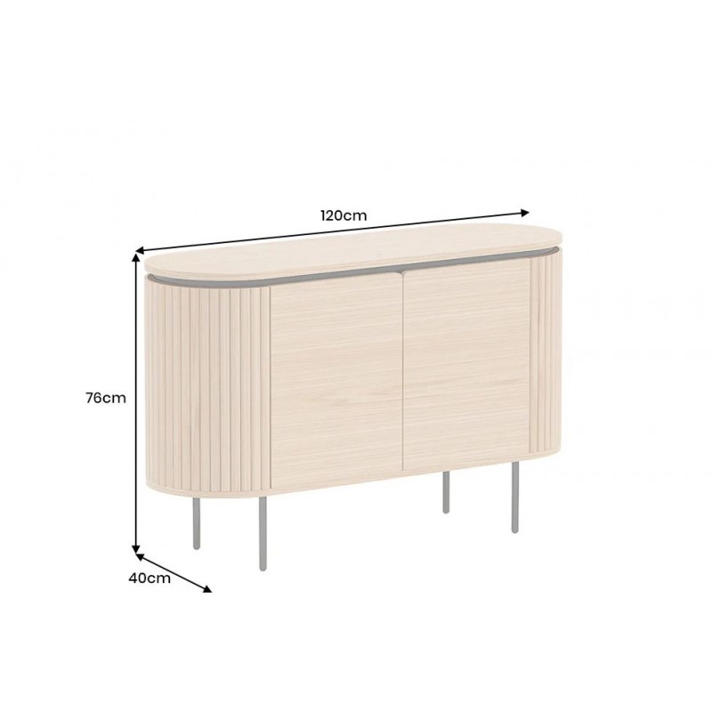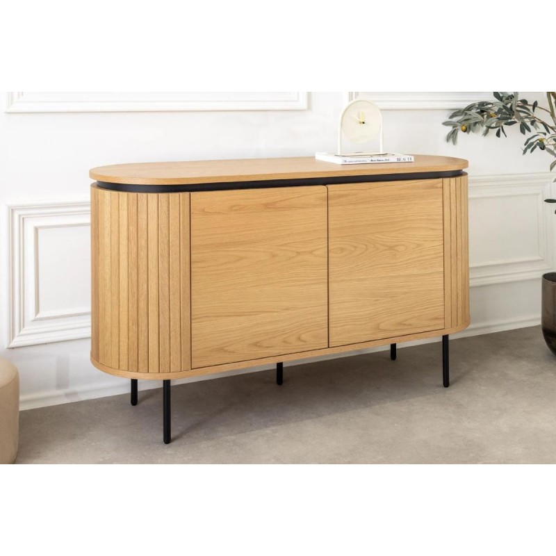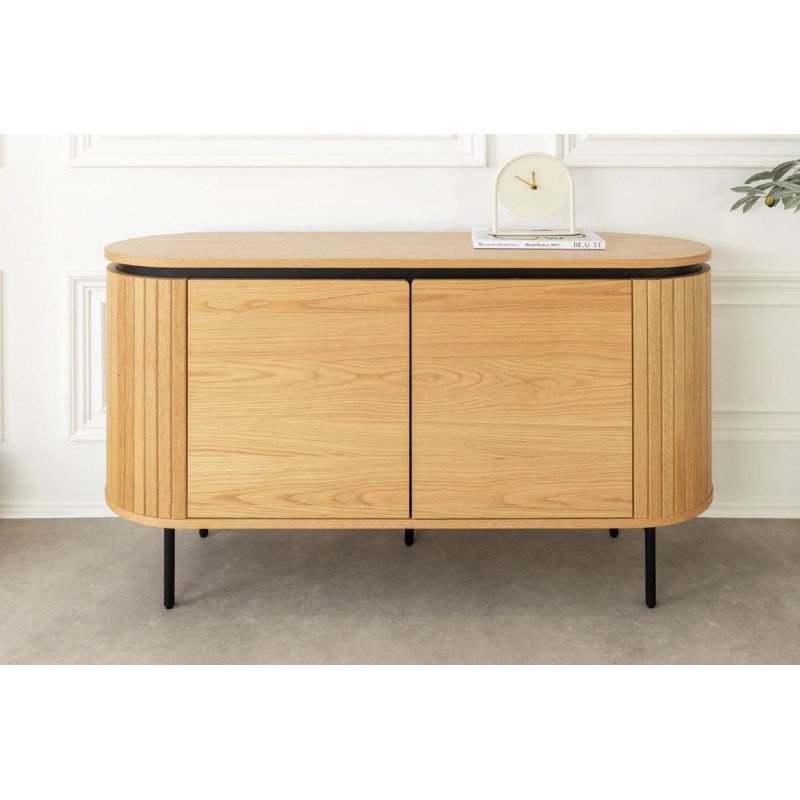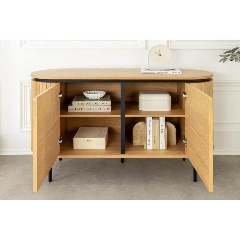 Ta owalna elegancka komoda idealnie wpisze się nie tylko w klasyczne, ale także minimalistyczne nowoczesne wnętrze. Mebel ten wykonany został z płyty MDF oklejonej imitacją dębu, który został osadzony na stabilnej czarnej metalowej podstawie. Dzięki swojej smukłej linii całość tej szafki wspaniale komponuje się z podstawą utrzymaną w ciemnej tonacji. Posiada podwójną pojemną półkę z zamykanymi drzwiczkami, która bez wątpienia pomieści rzeczy codziennego użytku np: książki, dokumenty oraz zastawę stołową oferując tym samym dużą powierzchnię do ich przechowywania. Zaletą tej komody jest funkcjonalność, wytrzymałość oraz łatwość czyszczenia, wyróżnia się swoją wyrazistością, kolorem i strukturą powodując, że każdy egzemplarz jest unikatowy. Fronty lamelowe w imitacji dębu ze strukturą drewna nadają jej cennego i naturalnego wyrazu. Ponadto wykonana jest niewątpliwie z dużą precyzją, dzięki zachowaniu i odwzorcowaniu naturalnej oryginalności zarówno słojów jak i sęków. Połączenie wyglądu metalu oraz dębu nadaje mu industrialny charakter, który również wspaniale wzbogaci każdy nowoczesny salon.