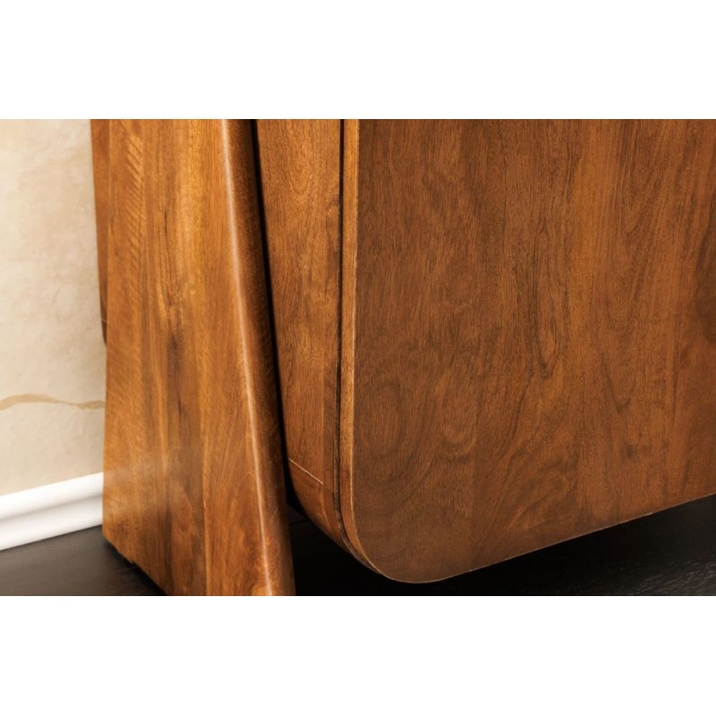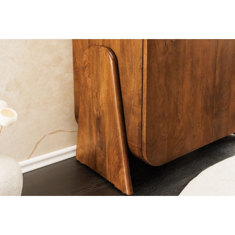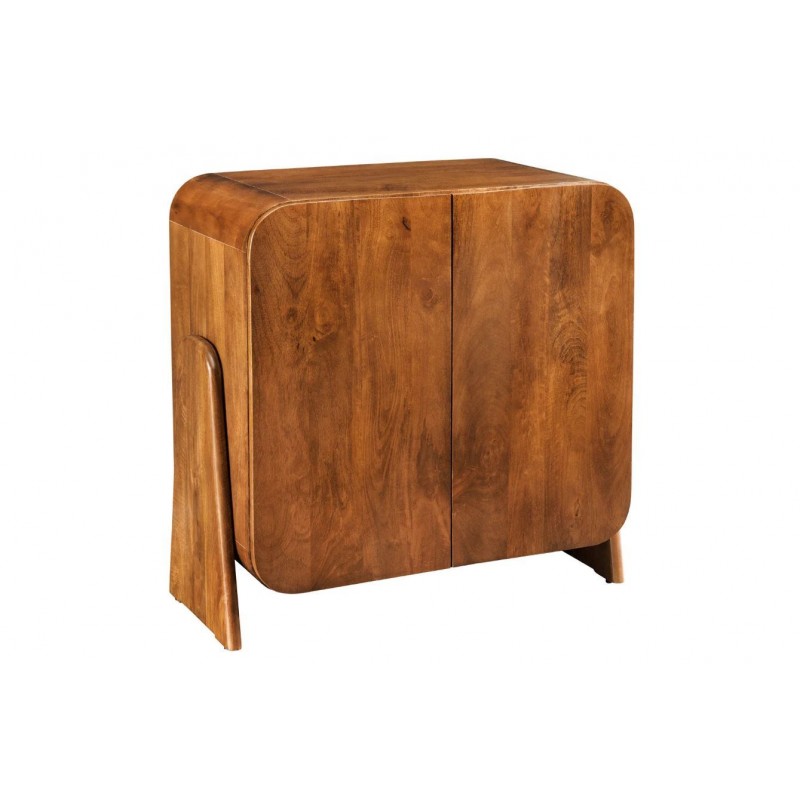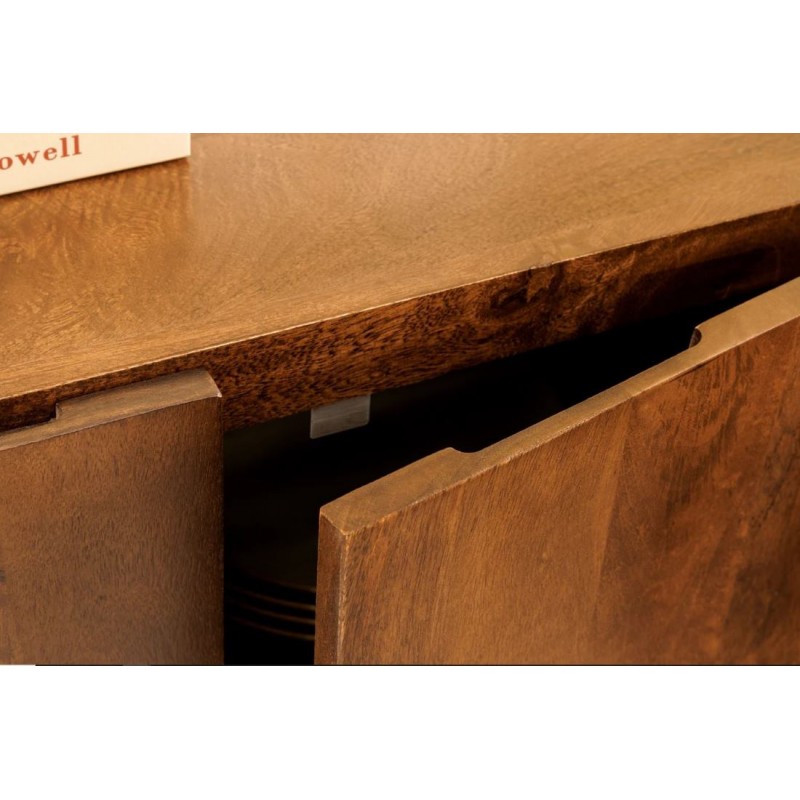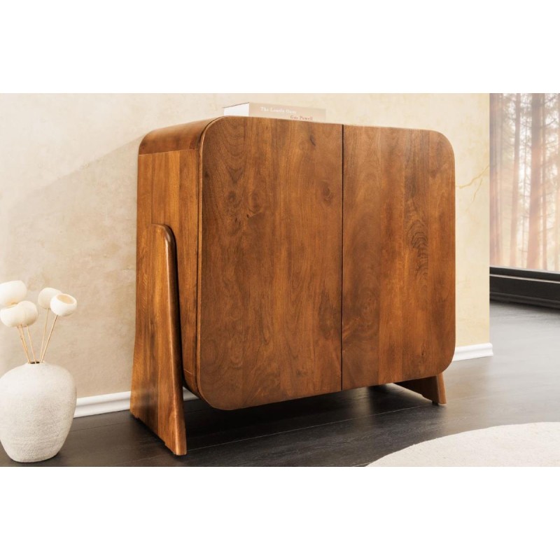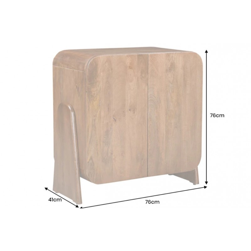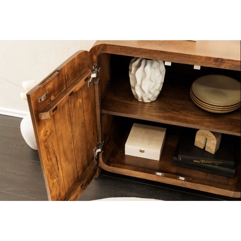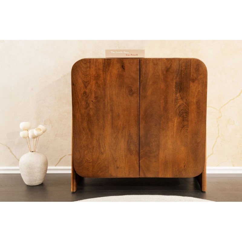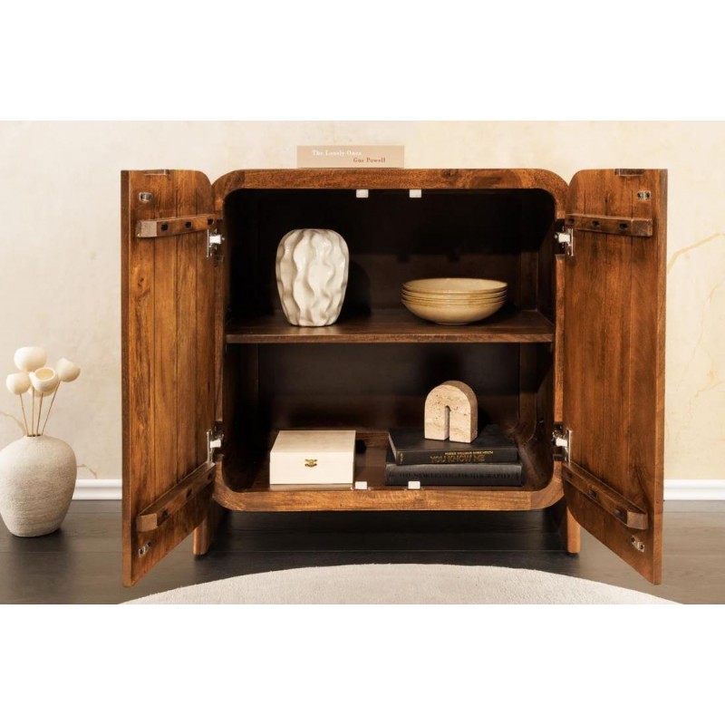 Ta elegancka komoda doskonale odnajdzie się zarówno w przestrzeniach industrialnych, jak i w nowoczesnych, minimalistycznych wnętrzach, także tych o niewielkim metrażu. Wykonana z litego drewna mango w ciepłym brązowym odcieniu, zachwyca opływowymi, zaokrąglonymi kształtami, które nadają jej lekkości mimo solidnej i trwałej konstrukcji. Wyposażona jest w jedną podwójną pojemną półkę, która bez problemu zdoła pomieścić rzeczy codziennego użytku, książki czy zastawę stołową, oferując tym samym dużą powierzchnię do przechowywania. Zaletą tej komody jest funkcjonalność, wytrzymałość oraz łatwość czyszczenia, wyróżnia się swoją wyrazistością, kolorem i strukturą powodując, że każdy egzemplarz jest unikatowy. Smukła linia korpusu oraz jednolita tonacja konstrukcji i podstawy nadają jej wyjątkowej elegancji. Precyzyjne wykonanie podkreśla oryginalny charakter drewna, zachowując jego naturalną strukturę. Idealnie sprawdzi się w salonach oraz jadalniach urządzonych w stylu nowoczesnym gdzie stanie się nie tylko funkcjonalnym meblem, ale także przepiękną dekoracją, która doda wnętrzu unikatowego wykończenia i niesamowitego wyglądu.