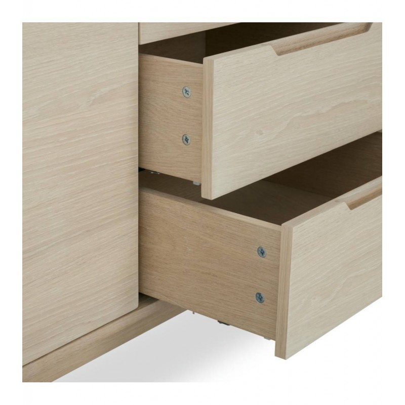Komoda KERTEMINDE to idealne rozwiązanie do każdego wnętrza w stylu nowoczesnym, dodająca przestrzeni niezwykle naturalnego wykończenia. Została wykonana z wysokiej jakości materiałów, takich jak lite drewno dębowe, fornir dębowy oraz płyta MDF, zapewniająca trwałość i elegancki wygląd. Powierzchnie wykończono olejem na bazie bielonego forniru dębowego, który nadaje ciepła i wyrafinowania każdemu wnętrzu harmonijnie komponując się z różnymi stylami aranżacji. Komoda ta wyposażona jest w system cichego zamykania, co sprawia, że jej użytkowanie jest wyjątkowo funkcjonalne i komfortowe. Frezowane uchwyty podkreślają nowoczesny i elegancki design mebla. Wyposażona jest w trzy pojemne szuflady oraz dwie podwójne szafki, dzięki czemu całość mebla bez problemu pomieści najpotrzebniejsze przedmioty codziennego użytku, oferując tym samym dużą powierzchnię do przechowywania. Zaletą tego mebla jest funkcjonalność, wytrzymałość oraz łatwość czyszczenia, ponadto wyróżnia się swoją wyrazistością, kolorem i strukturą powodując, że każdy egzemplarz jest unikatowy. Zaprojektowana jest niewątpliwie z dużą precyzją, dzięki zachowaniu naturalnej oryginalności drzewa zarówno słojów jak i sęków, które prezentują się fenomenalnie, nadając tym samym meblowi oryginalnego charakteru. Komoda KERTEMINDE sprawdzi się znakomicie w każdym nowoczesnym salonie, gdzie stanie się nie tylko funkcjonalnym meblem, ale także przepiękną dekoracją, dzięki której pomieszczenie nabierze ciepła i naturalnego efektu.