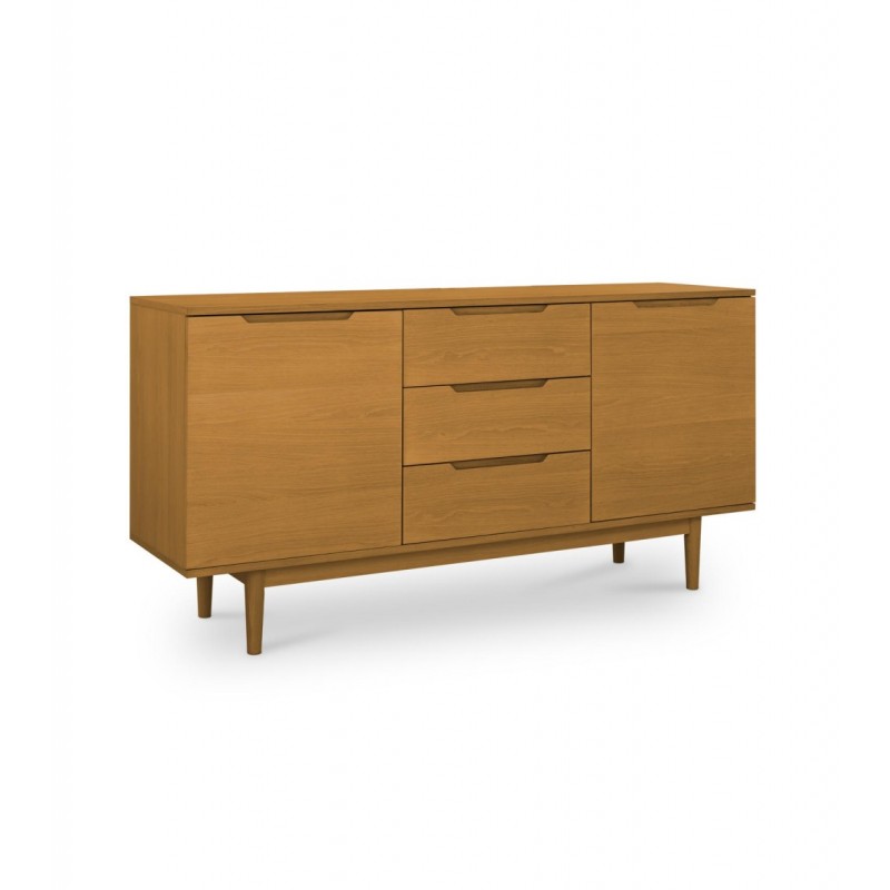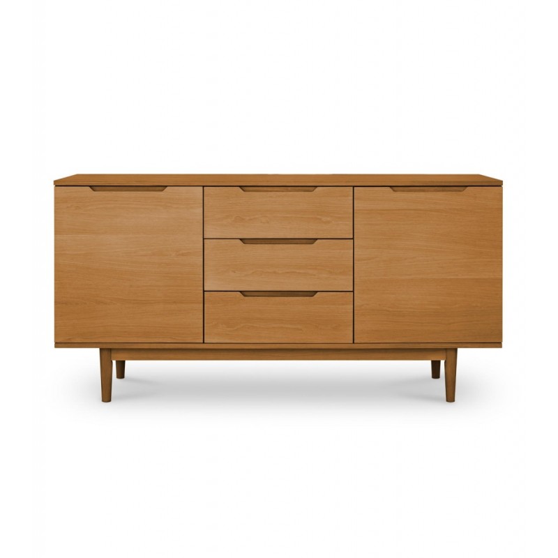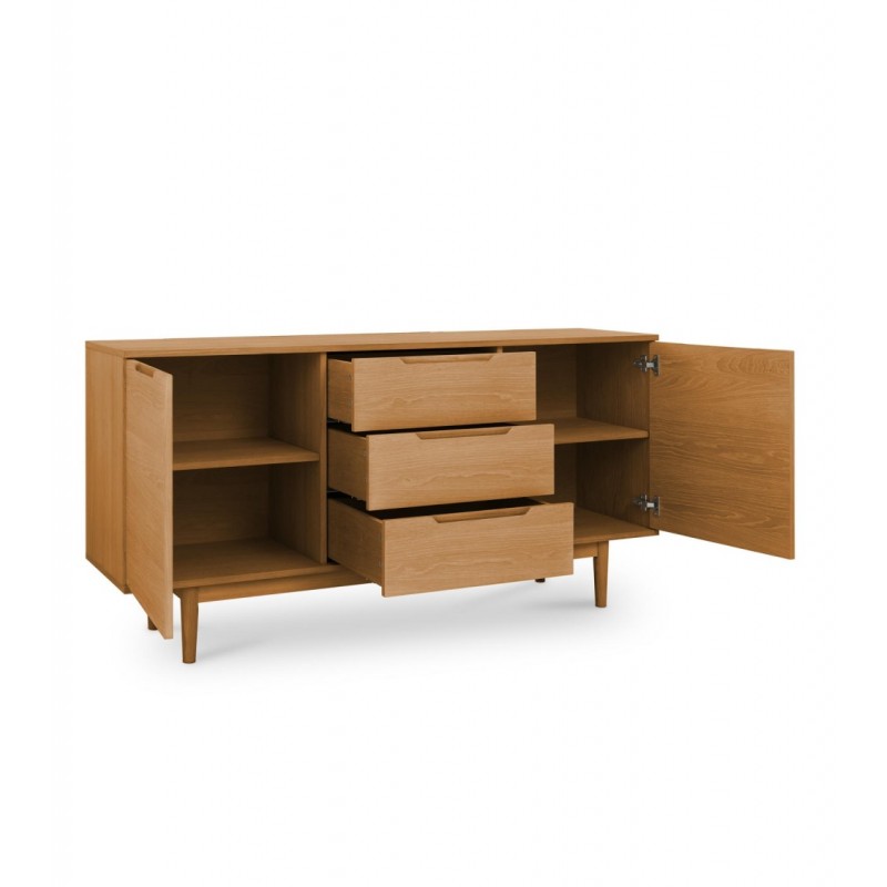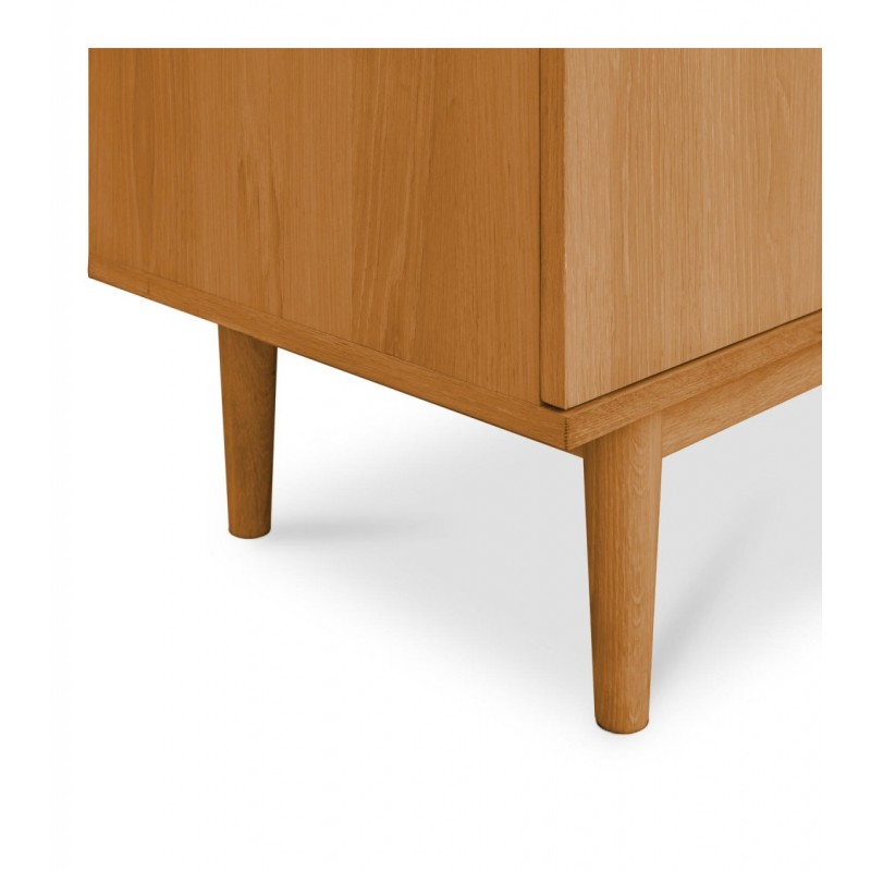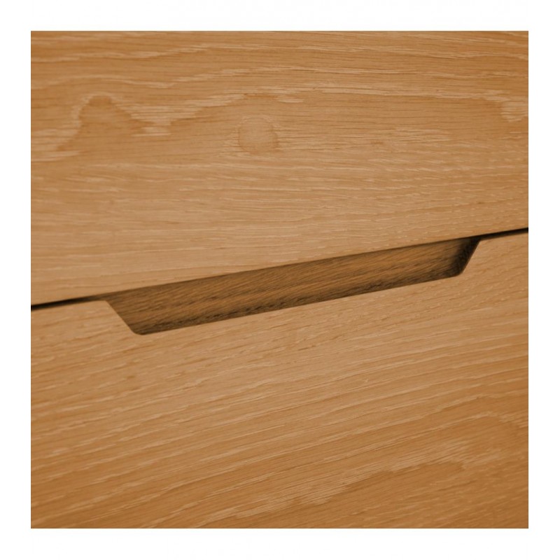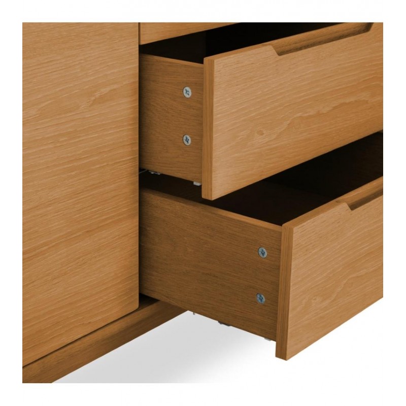 Komoda KERTEMINDE to idealne rozwiązanie do każdego wnętrza w stylu nowoczesnym, dodająca przestrzeni niezwykle naturalnego wykończenia. Została wykonana z wysokiej jakości materiałów, takich jak lite drewno dębowe, fornir dębowy oraz płyta MDF, zapewniająca trwałość i elegancki wygląd. Powierzchnie wykończono naturalnym olejem na bazie forniru dębowego, który nadaje ciepła i wyrafinowania każdemu wnętrzu harmonijnie komponując się z różnymi stylami aranżacji. Komoda ta wyposażona jest w system cichego zamykania, co sprawia, że jej użytkowanie jest wyjątkowo funkcjonalne i komfortowe. Frezowane uchwyty podkreślają nowoczesny i elegancki design mebla. Wyposażona jest w trzy pojemne szuflady oraz dwie podwójne szafki, dzięki czemu całość mebla bez problemu pomieści najpotrzebniejsze przedmioty codziennego użytku, oferując tym samym dużą powierzchnię do przechowywania. Zaletą tego mebla jest funkcjonalność, wytrzymałość oraz łatwość czyszczenia, ponadto wyróżnia się swoją wyrazistością, kolorem i strukturą powodując, że każdy egzemplarz jest unikatowy. Zaprojektowana jest niewątpliwie z dużą precyzją, dzięki zachowaniu naturalnej oryginalności drzewa zarówno słojów jak i sęków, które prezentują się fenomenalnie, nadając tym samym meblowi oryginalnego charakteru. Komoda KERTEMINDE sprawdzi się znakomicie w każdym nowoczesnym salonie, gdzie stanie się nie tylko funkcjonalnym meblem, ale także przepiękną dekoracją, dzięki której pomieszczenie nabierze ciepła i naturalnego efektu.