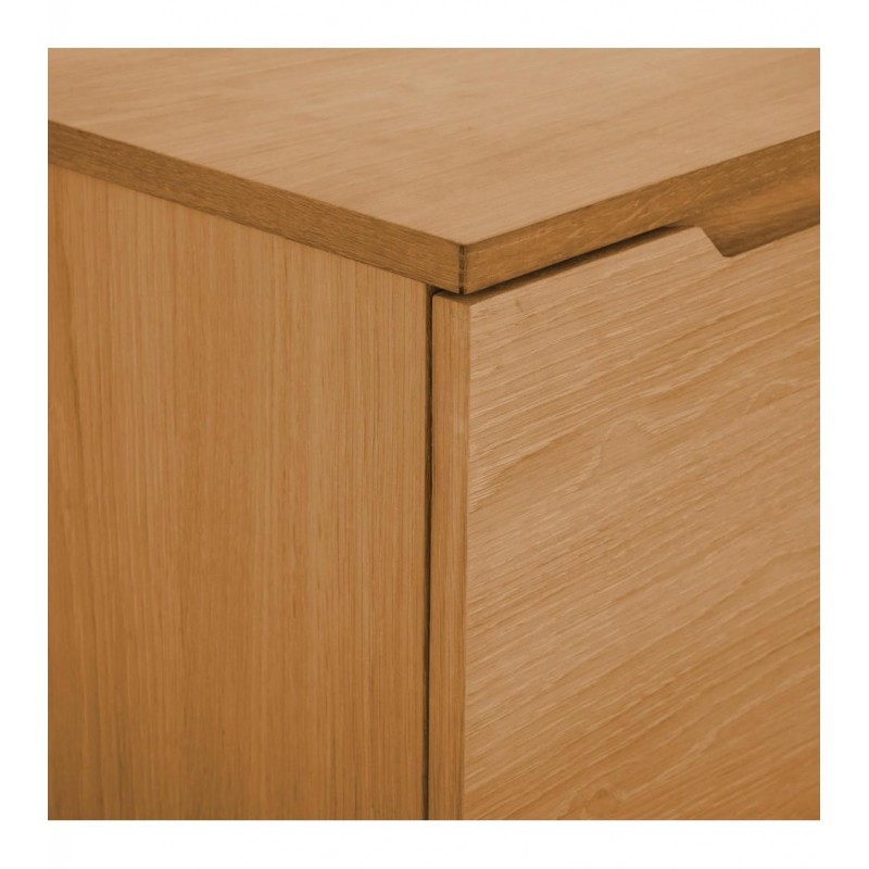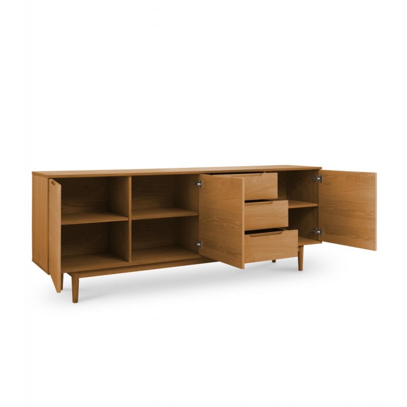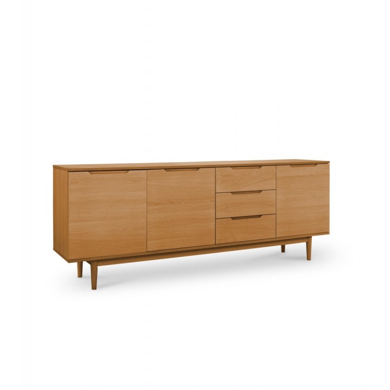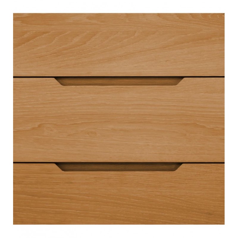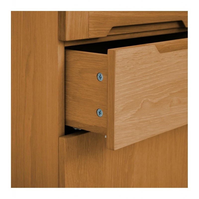 Komoda KERTEMINDE to idealne rozwiązanie do każdego wnętrza w stylu nowoczesnym, dodająca przestrzeni niezwykle naturalnego wykończenia. Została wykonana z wysokiej jakości materiałów, takich jak lite drewno dębowe, fornir dębowy oraz płyta MDF, zapewniająca trwałość i elegancki wygląd. Powierzchnie wykończono naturalnym olejem na bazie forniru dębowego, który nadaje ciepła i wyrafinowania każdemu wnętrzu harmonijnie komponując się z różnymi stylami aranżacji. Komoda ta wyposażona jest w system cichego zamykania, co sprawia, że jej użytkowanie jest wyjątkowo funkcjonalne i komfortowe. Frezowane uchwyty podkreślają nowoczesny i elegancki design mebla. Wyposażona jest w trzy pojemne szuflady oraz trzy podwójne szafki, dzięki czemu całość mebla bez problemu pomieści najpotrzebniejsze przedmioty codziennego użytku, oferując tym samym dużą powierzchnię do przechowywania. Zaletą tego mebla jest funkcjonalność, wytrzymałość oraz łatwość czyszczenia, ponadto wyróżnia się swoją wyrazistością, kolorem i strukturą powodując, że każdy egzemplarz jest unikatowy. Zaprojektowana jest niewątpliwie z dużą precyzją, dzięki zachowaniu naturalnej oryginalności drzewa zarówno słojów jak i sęków, które prezentują się fenomenalnie, nadając tym samym meblowi oryginalnego charakteru. Komoda KERTEMINDE sprawdzi się znakomicie w każdym nowoczesnym salonie, gdzie stanie się nie tylko funkcjonalnym meblem, ale także przepiękną dekoracją, dzięki której pomieszczenie nabierze ciepła i naturalnego efektu.