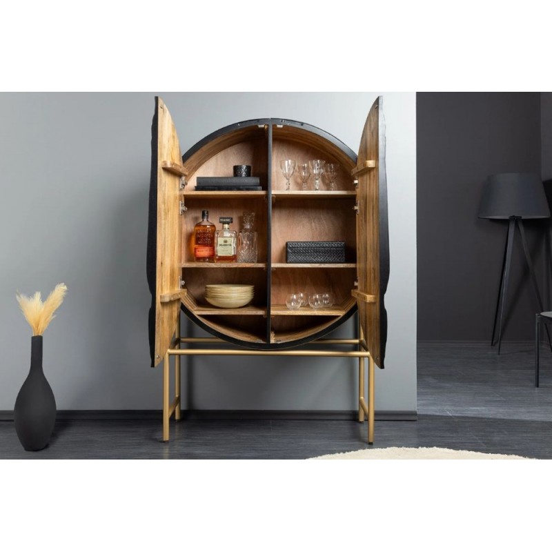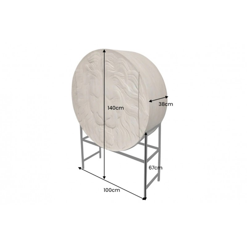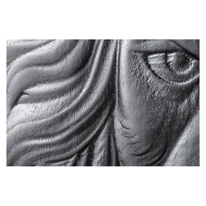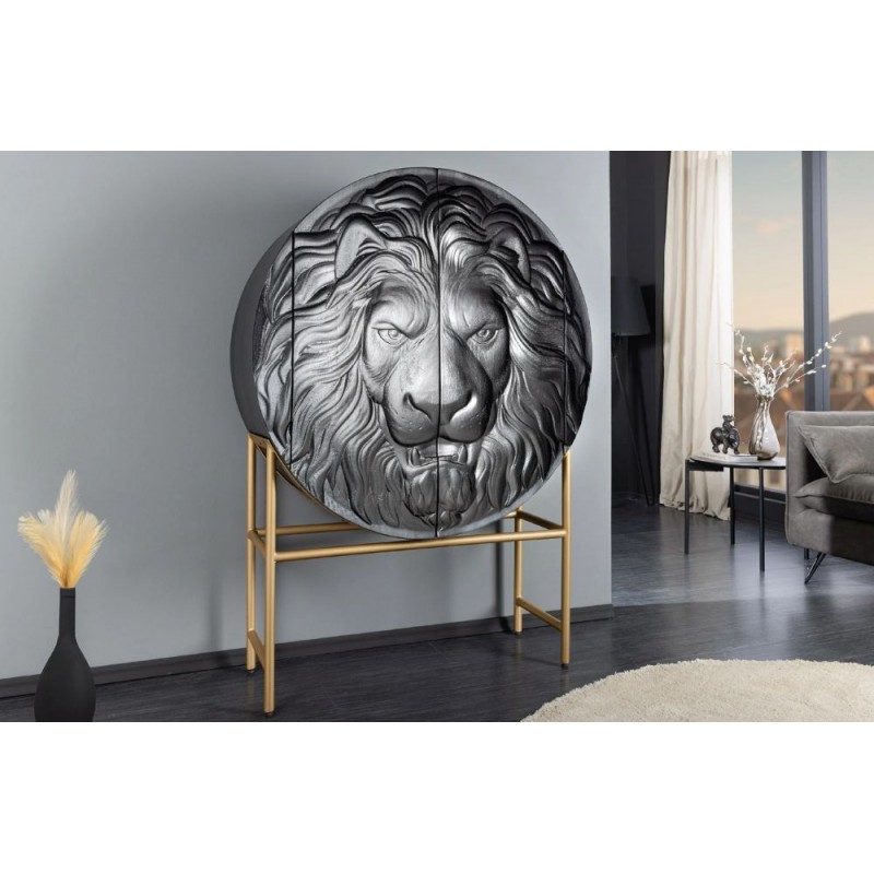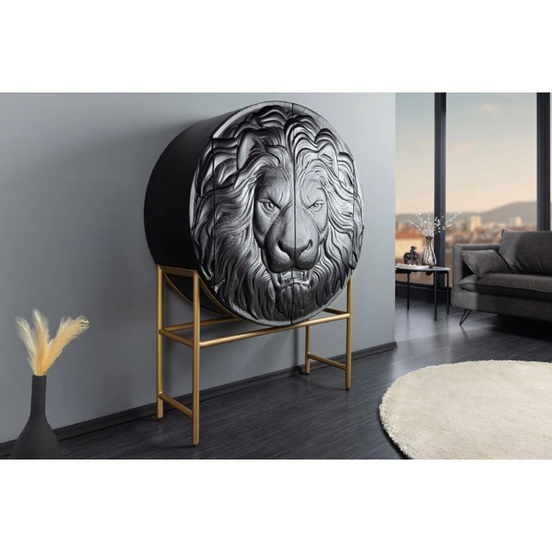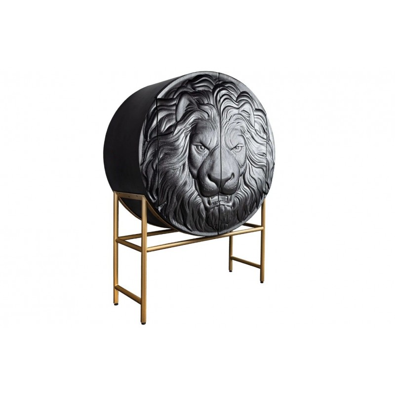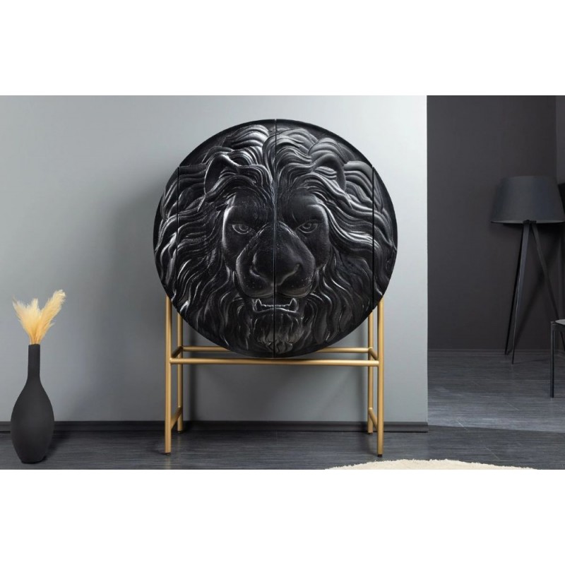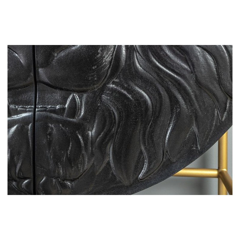 Komoda LION to niezwykle wyjątkowy mebel wykonany w całości z litego drewna mango koloru czarnego. Jej projekt wyróżnia się precyzyjnym wykonaniem, które podkreśla naturalne piękno drewna. Zachowane widoczne słoje i sęki nadają jej niezwykłej autentyczności co sprawia, że doskonale wpisuje się w styl nowoczesny. Głównym elementem komody jest ręcznie zdobiony, front drzwiczek, który zachwyca unikatowym trójwymiarowym wzorem 3D przedstawiającym głowę lwa. Ten artystyczny detal od razu przyciąga uwagę, nadając mu niepowtarzalny charakter. Mebel ten jest bardzo pojemny, posiada dwie potrójne duże półki, które bez wątpienia pomieszczą rzeczy codziennego użytku np: książki, dokumenty oraz zastawę stołową oferując tym samym dużą powierzchnię do przechowywania. Dodatkową zaletą tej komody jest wytrzymałość oraz łatwość czyszczenia, ponadto wyróżnia się swoją wyrazistością, kolorem i strukturą powodując, że każdy egzemplarz jest niepowtarzalny i unikatowy. Stabilna, prostokątna podstawa w złotym kolorze nie tylko dodaje meblowi elegancji, ale także zwiększa jej praktyczność, pozwalając na łatwe dopasowanie do różnych aranżacji wnętrz. Komoda LION sprawdzi się znakomicie w każdym nowoczesnym salonie, gdzie stanie się nie tylko funkcjonalnym meblem, ale także przepiękną dekoracją.