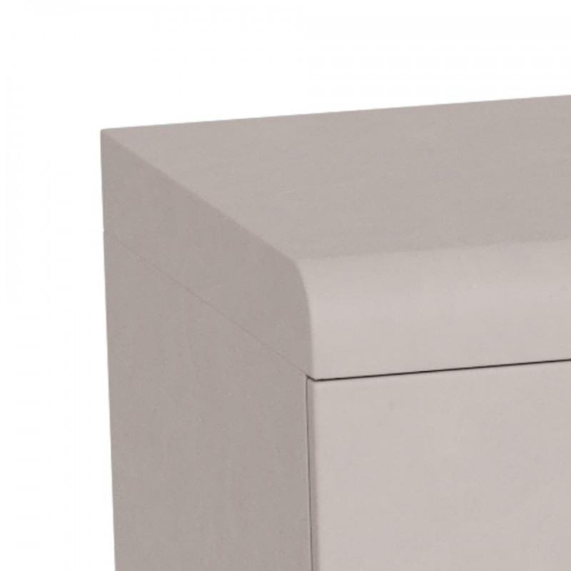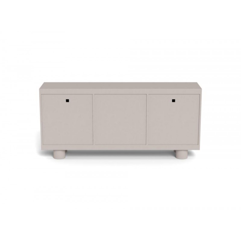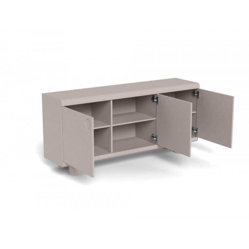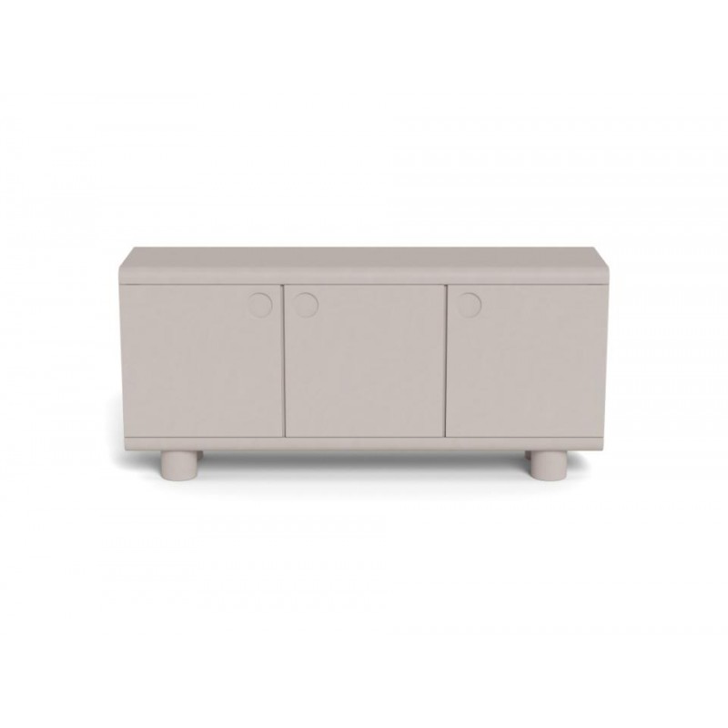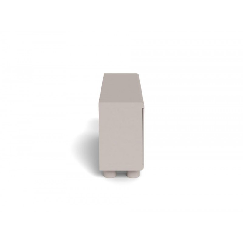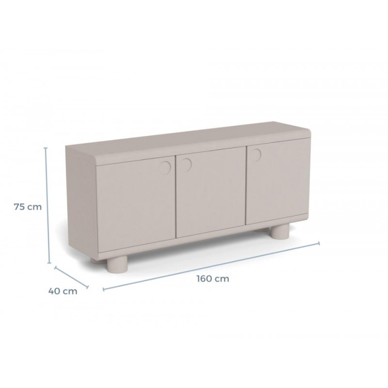Ta komoda wyróżnia się zabawną, miękką sylwetką oraz wyrazistym szarym wykończeniem, które nadaje jej nowoczesnego, a jednocześnie przyjaznego charakteru. Trzy zamykane drzwi skrywają funkcjonalne wnętrze z trzema półkami, oferując dużo miejsca do przechowywania i pomagając utrzymać porządek w przestrzeni. Zaokrąglone detale oraz subtelne uchwyty stanowią estetyczne wykończenie całości i podkreślają unikalny charakter mebla. Komoda doskonale sprawdzi się zarówno w salonie, jak i w jadalni, łącząc praktyczność z wyrazistym designem, który wnosi do wnętrza lekkość i styl.