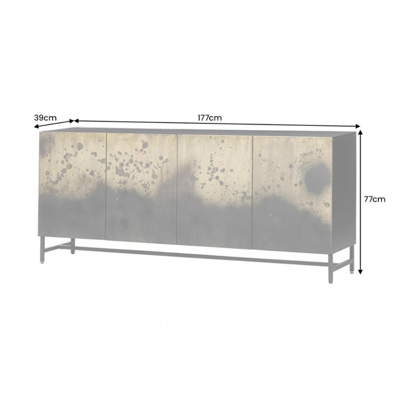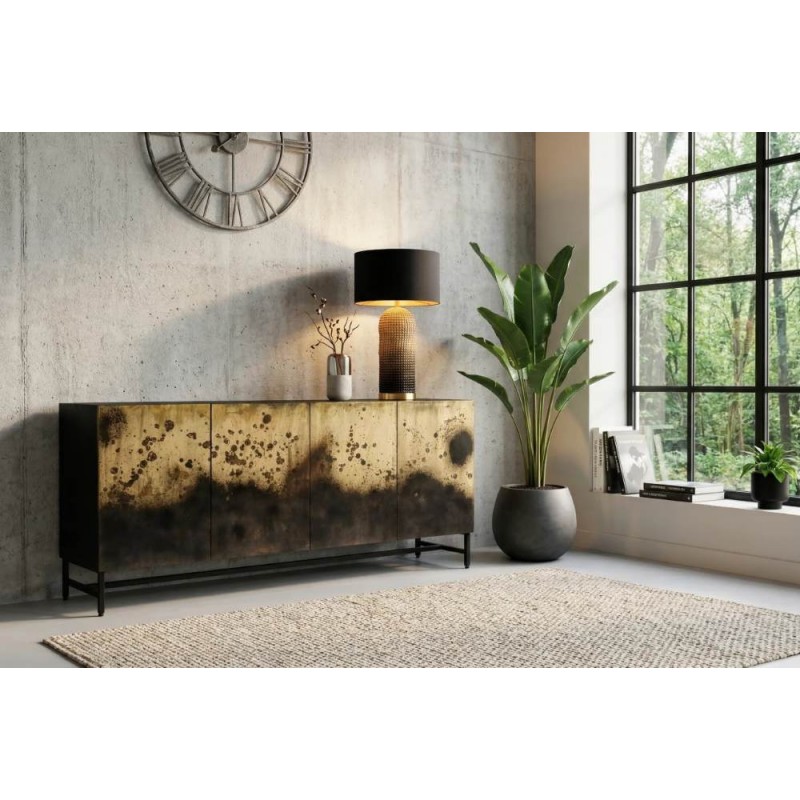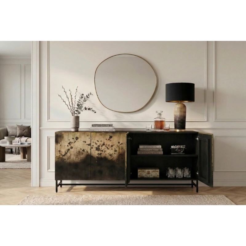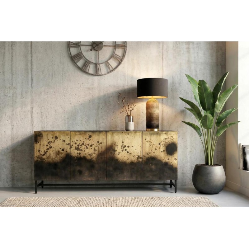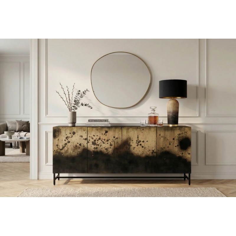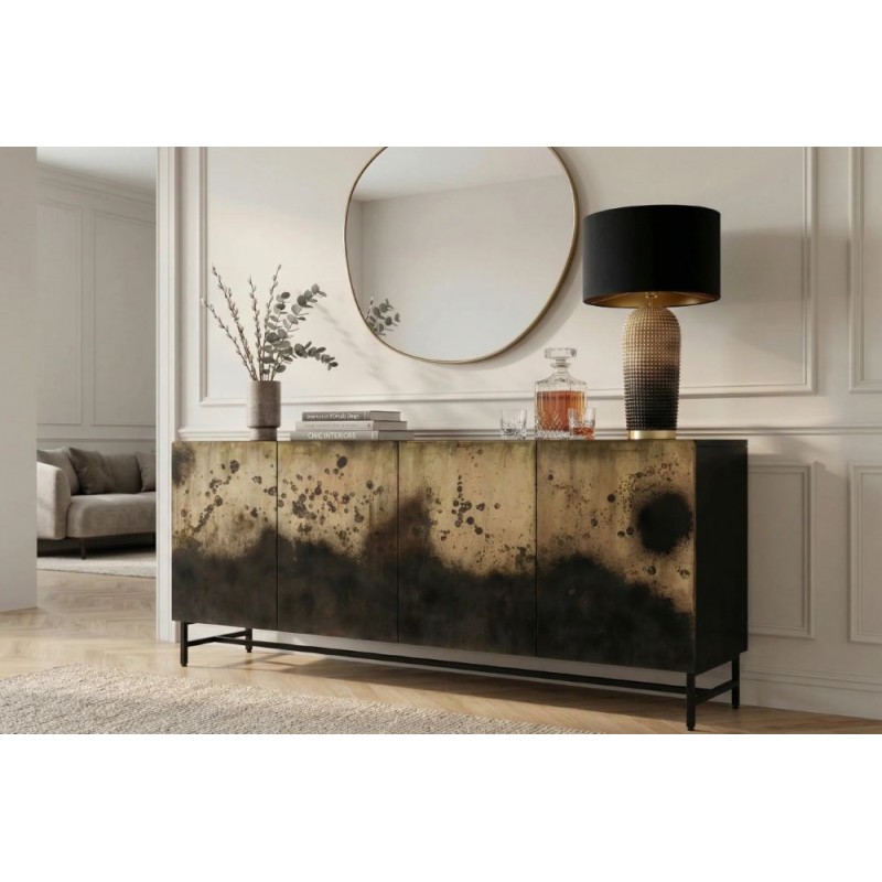 Komoda OXID to wyrazisty mebel o nowoczesnym charakterze, który przyciąga uwagę unikalnym wykończeniem inspirowanym efektem utlenionego metalu. Głównym elementem są fronty wykonane z drewna mango, które zachwycają niepowtarzalną strukturą oraz artystycznym przejściem kolorów od głębokiej czerni po szlachetne odcienie złota. Ten artystyczny detal od razu przyciąga uwagę, nadając meblowi niepowtarzalny charakter. Wyposażona jest w dwie podwójne pojemne półki, które bez problemu zdołają pomieścić rzeczy codziennego użytku, książki czy zastawę stołową, oferując tym samym dużą powierzchnię do przechowywania. Zaletą tej komody jest funkcjonalność, wytrzymałość oraz łatwość czyszczenia, wyróżnia się swoją wyrazistością, kolorem i strukturą powodując, że każdy egzemplarz jest unikatowy. Całość osadzona została na stabilnej, czarnej metalowej podstawie malowanej proszkowo, która nadaje jej lekkości i industrialnego stylu. Posiada regulowane nóżki umożliwiające precyzyjne dopasowanie wysokości oraz stabilne ustawienie na nierównych powierzchniach według własnych preferencji. Komoda OXID to nie tylko efektowny element aranżacji, ale również funkcjonalne rozwiązanie do salonu, jadalni czy przestrzeni loftowych. Dzięki swojej ponadczasowej estetyce i eleganckiemu połączeniu czerni ze złotem, doskonale wpisuje się w każde nowoczesne wnętrze, dodając mu charakteru oraz wyjątkowego stylu.