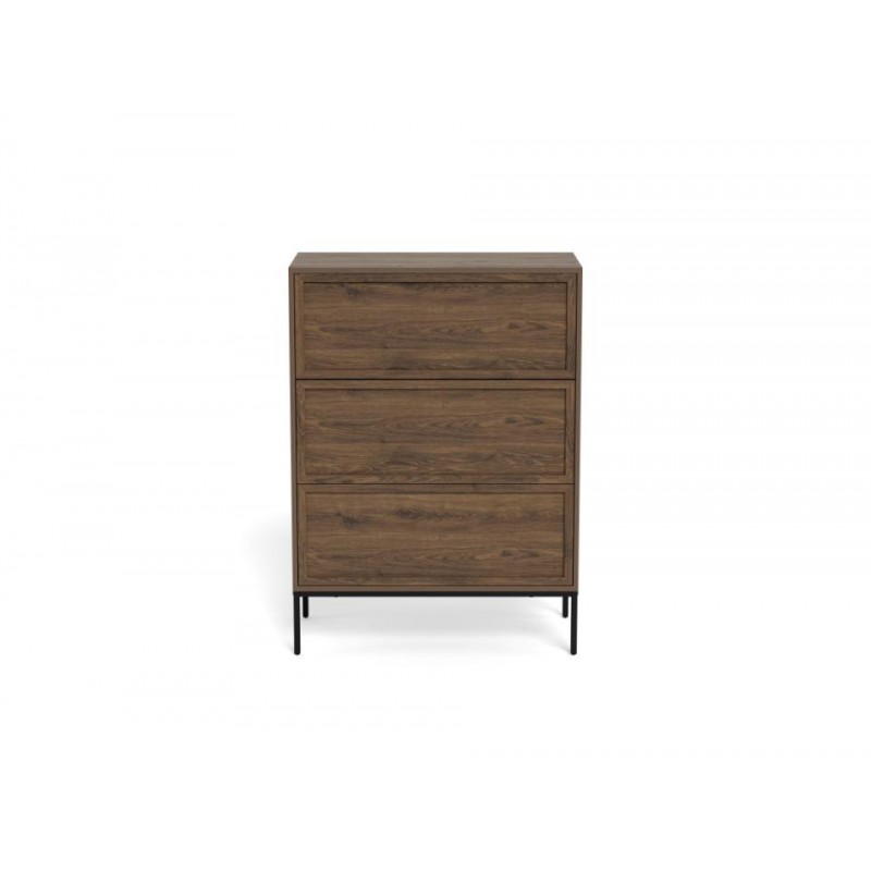 Trzy pojemne szuflady wyposażone w system push-to-open zapewniają wygodny dostęp do przechowywanych przedmiotów i eliminują potrzebę uchwytów, wzmacniając minimalistyczną estetykę mebla. Komoda osadzona jest na smukłych, kwadratowych nogach ze stali malowanej proszkowo w kolorze czarnym, co nadaje konstrukcji wizualnej lekkości i stabilności. Palmdale doskonale łączy estetykę z praktycznością, stanowiąc stylowe i łatwe w utrzymaniu rozwiązanie do sypialni, salonu lub garderoby.