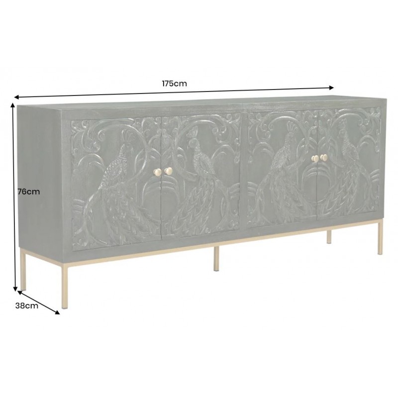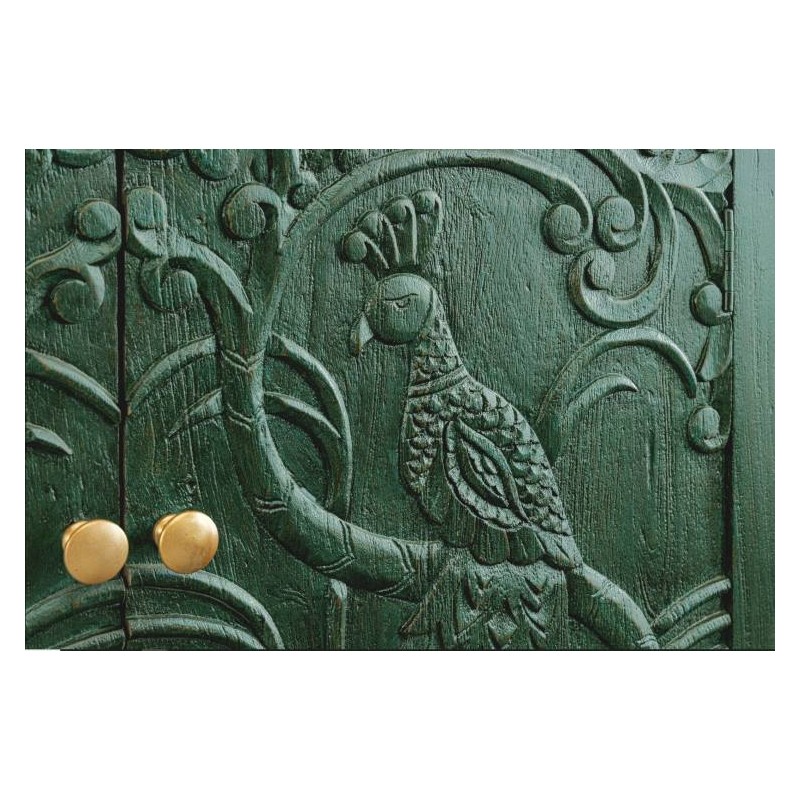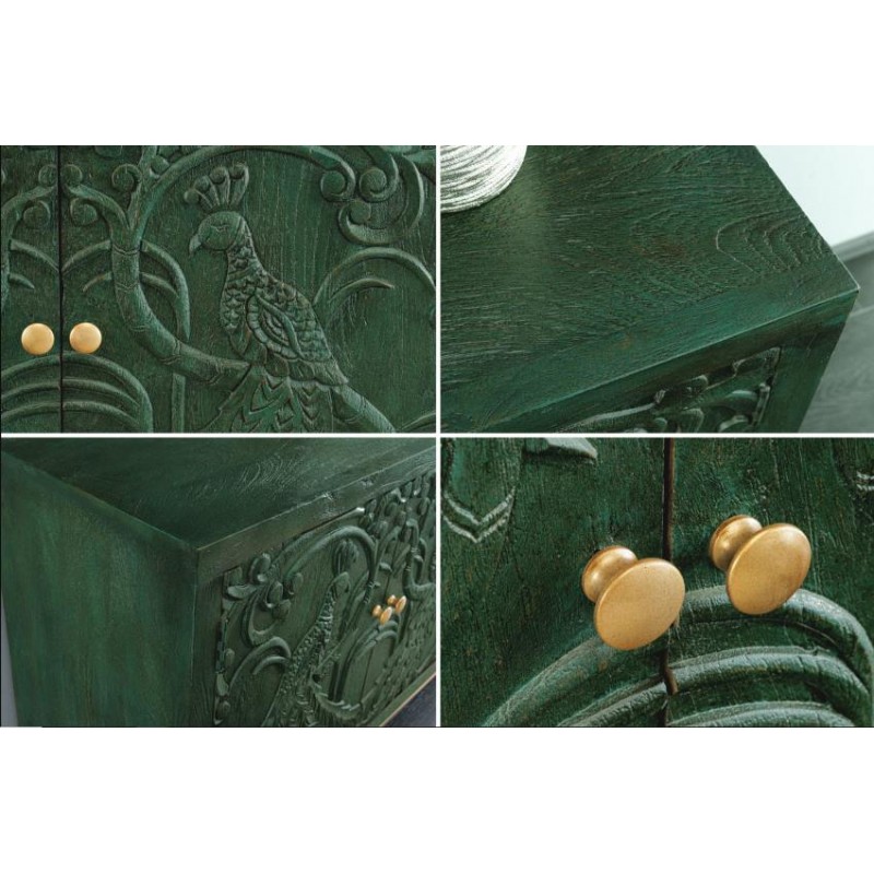 Komoda PEACOCK to niezwykle wyjątkowy mebel wykonany w całości z litego drewna mango o barwie ciemnozielonej. Jej projekt wyróżnia się precyzyjnym wykonaniem, które podkreśla naturalne piękno drewna. Zachowane widoczne słoje i sęki nadają jej niezwykłej autentyczności co sprawia, że doskonale wpisuje się w styl nowoczesny. Głównym elementem komody są ręcznie zdobione, przetarte fronty drzwiczek, które zachwycają unikatowym trójwymiarowym wzorem 3D przedstawiającym pawie. Ten artystyczny detal od razu przyciąga uwagę, nadając meblowi niepowtarzalny charakter. Mebel ten jest bardzo pojemny, posiada dwie podwójne duże półki, które bez wątpienia pomieszczą rzeczy codziennego użytku np: książki, dokumenty oraz zastawę stołową oferując tym samym dużą powierzchnię do przechowywania. Dodatkową zaletą tej komody jest wytrzymałość oraz łatwość czyszczenia, ponadto wyróżnia się swoją wyrazistością, kolorem i strukturą powodując, że każdy egzemplarz jest niepowtarzalny i unikatowy. Stabilna, prostokątna podstawa w złotym kolorze nie tylko dodaje meblowi elegancji, ale także zwiększa jej praktyczność, pozwalając na łatwe dopasowanie do różnych aranżacji wnętrz. Komoda PEACOCK sprawdzi się znakomicie w każdym nowoczesnym salonie, gdzie stanie się nie tylko funkcjonalnym meblem, ale także przepiękną dekoracją.