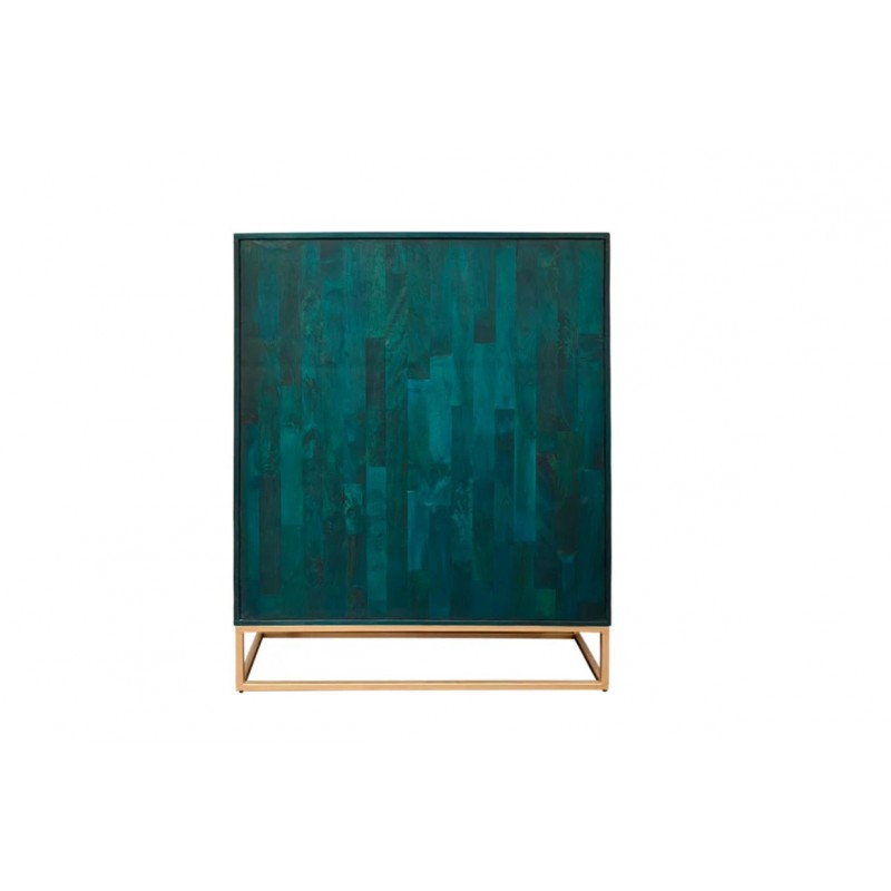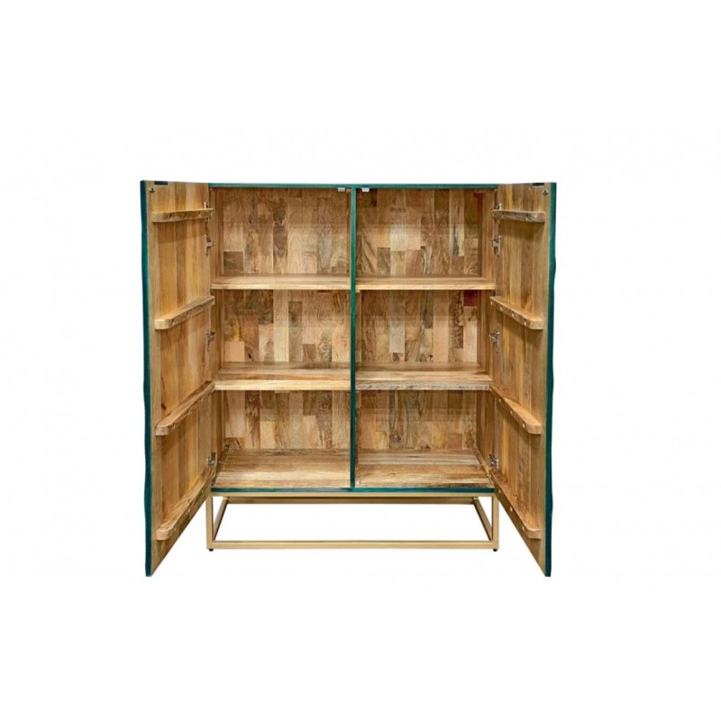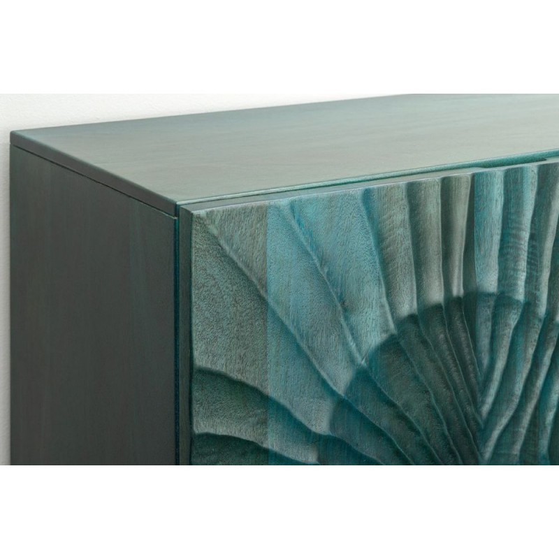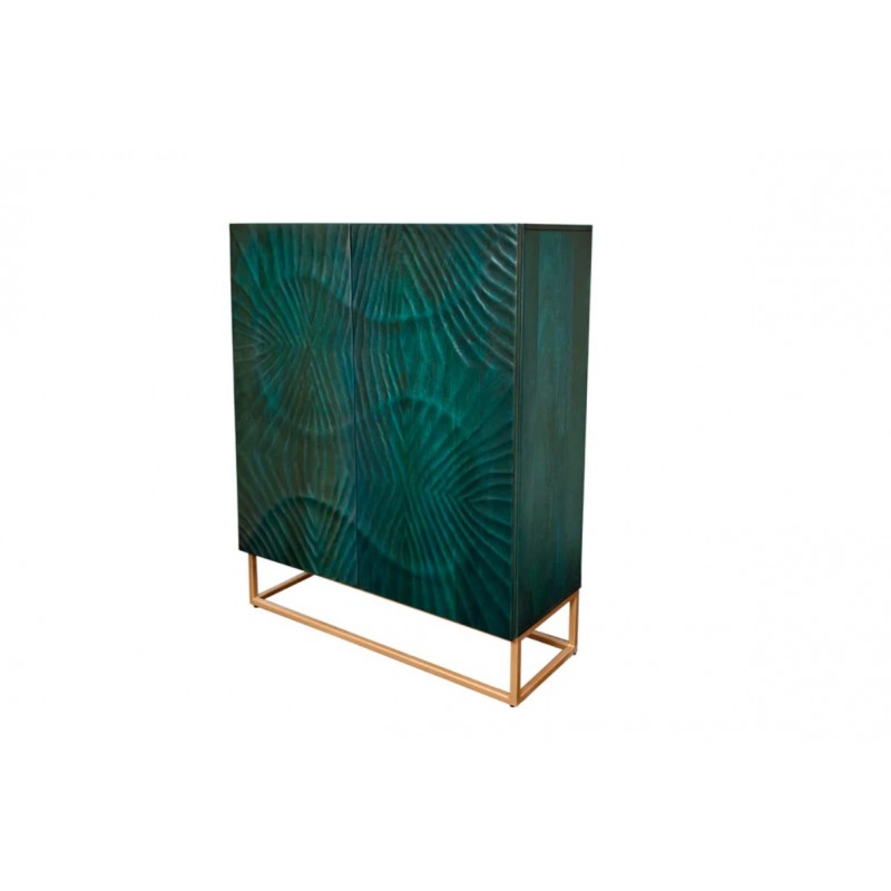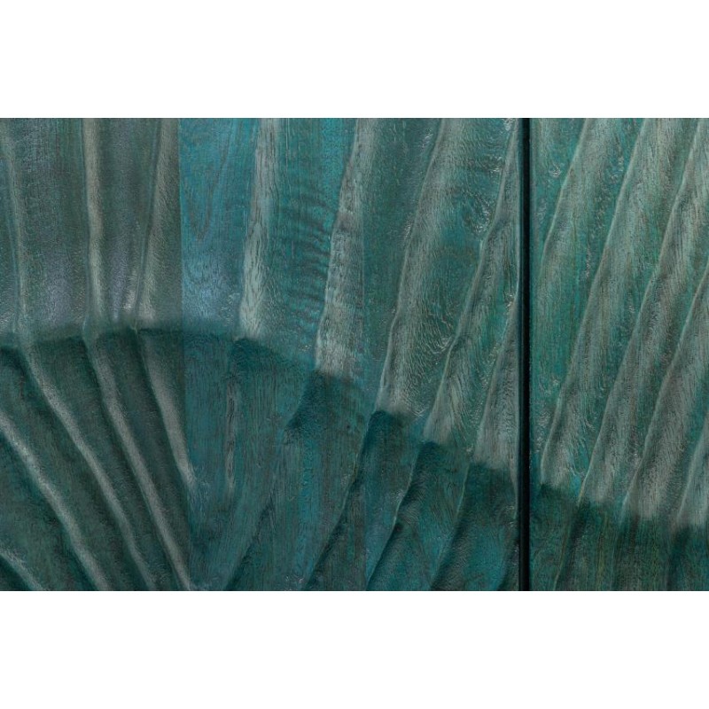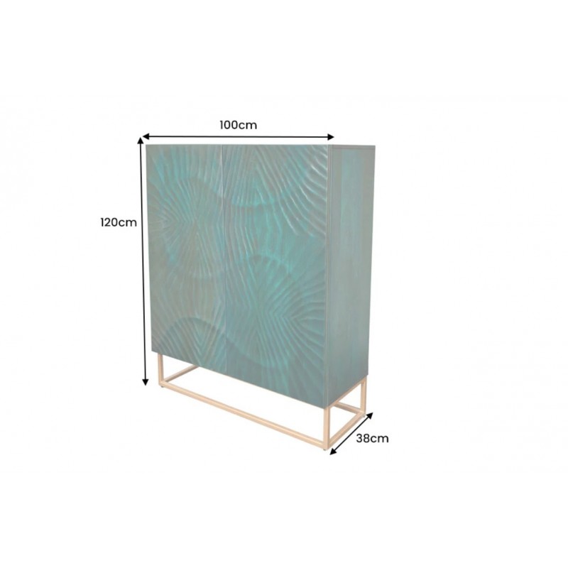 Komoda SCORPION została wykonana w całości z litego drewna mango o barwie niebieskiej w odcieniu turkusowym. Zaprojektowana jest niewątpliwie z dużą precyzją, dzięki zachowaniu naturalnej oryginalności drzewa zarówno słojów jak i sęków świetnie odzwierciedla styl nowoczesny. Bez wątpienia elementem robiącym największe wrażenie są poprzecierane frontowe drzwiczki ręcznie robione z unikatowym trójwymiarowym efektem 3D, które przyciągają wzrok i dodają meblowi niepowtarzalnego charakteru. Mebel ten jest bardzo pojemny, posiada dwie potrójne duże półki, które pomieszczą rzeczy codziennego użytku np: książki, dokumenty oraz zastawę stołową oferując tym samym dużą powierzchnię do przechowywania. Dodatkową zaletą tej szafki jest funkcjonalność, wytrzymałość oraz łatwość czyszczenia, ponadto wyróżnia się swoją wyrazistością, kolorem i strukturą powodując, że każdy egzemplarz jest unikatowy. Osadzona została na stabilnej prostokątnej podstawie w kolorze złotym, co czyni ją niezwykle praktyczną, dostosowującą się z łatwością do twoich potrzeb. Komoda SCORPION sprawdzi się znakomicie w każdym nowoczesnym salonie, gdzie stanie się nie tylko funkcjonalnym meblem, ale także przepiękną dekoracją.