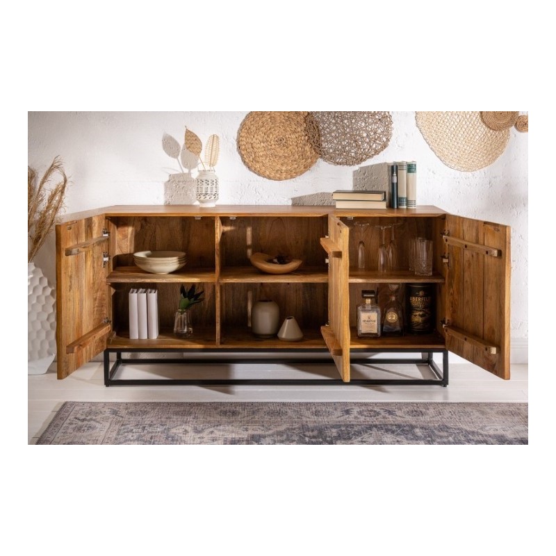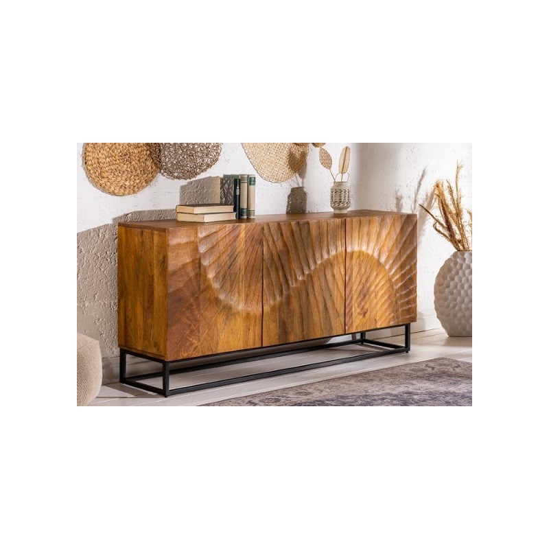 Komoda Scorpion to mebel wykonany z drewna mango. Posiada pojemne półki, które pomieszczą książki czy zastawę stołową. Przepiękne żłobienia na drzwiach frontowych niewątpliwie stanowią ciekawy, nietuzinkowy design. Wykonana z dużą precyzją niewątpliwie będzie wspaniałym dodatkiem do każdego nowoczesnego jak i klasycznego wnętrza.