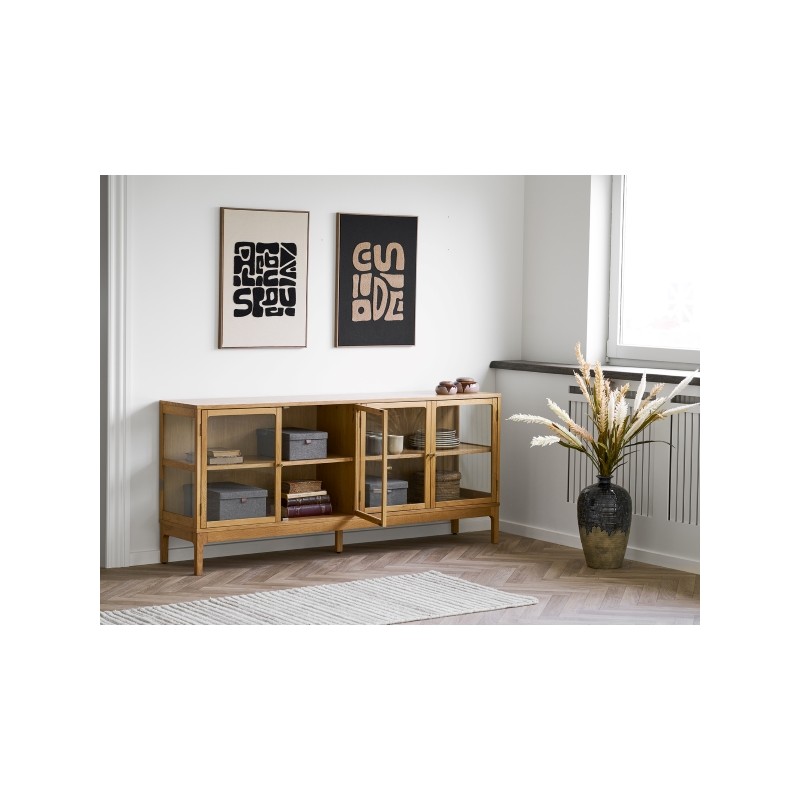 Wnętrze komody wyposażone jest w praktyczną półkę, która ułatwia organizację przechowywanych przedmiotów i zapewnia wygodny dostęp do zawartości. Dzięki wydłużonej formie i harmonijnym proporcjom mebel doskonale sprawdzi się w salonie, jadalni lub przestronnej kuchni, oferując dużą powierzchnię do przechowywania bez przytłaczania wnętrza. Połączenie naturalnych materiałów, prostej formy i szklanych detali sprawia, że komoda stanowi stylowy, a zarazem uniwersalny element wyposażenia, który wnosi do wnętrza elegancję i lekkość.