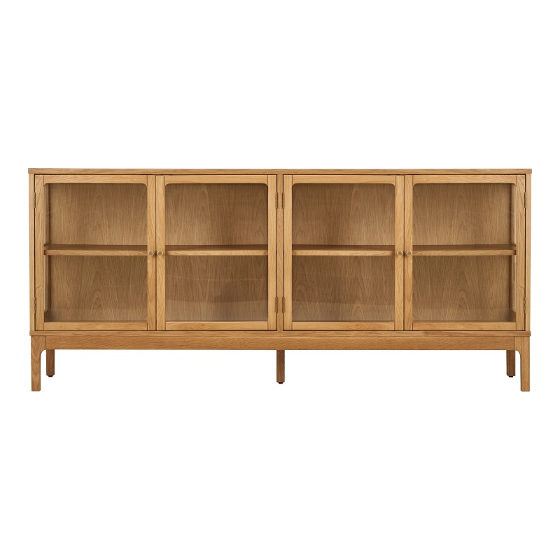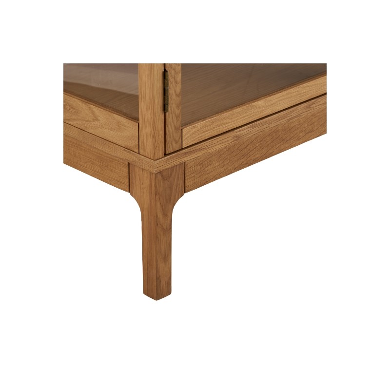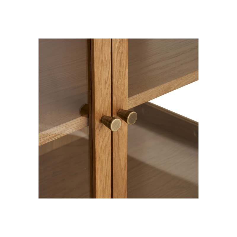 Ta komoda to eleganckie i funkcjonalne rozwiązanie, które doskonale odnajdzie się w nowoczesnych oraz skandynawskich aranżacjach wnętrz. Wykonana z forniru dębowego, zachwyca ciepłą kolorystyką i naturalnym usłojeniem, wprowadzając do przestrzeni przytulność i ponadczasowy charakter. Cztery przeszklone fronty z hartowanego szkła nadają bryle lekkości i pozwalają na efektowną ekspozycję zastawy stołowej, szkła lub dekoracji.