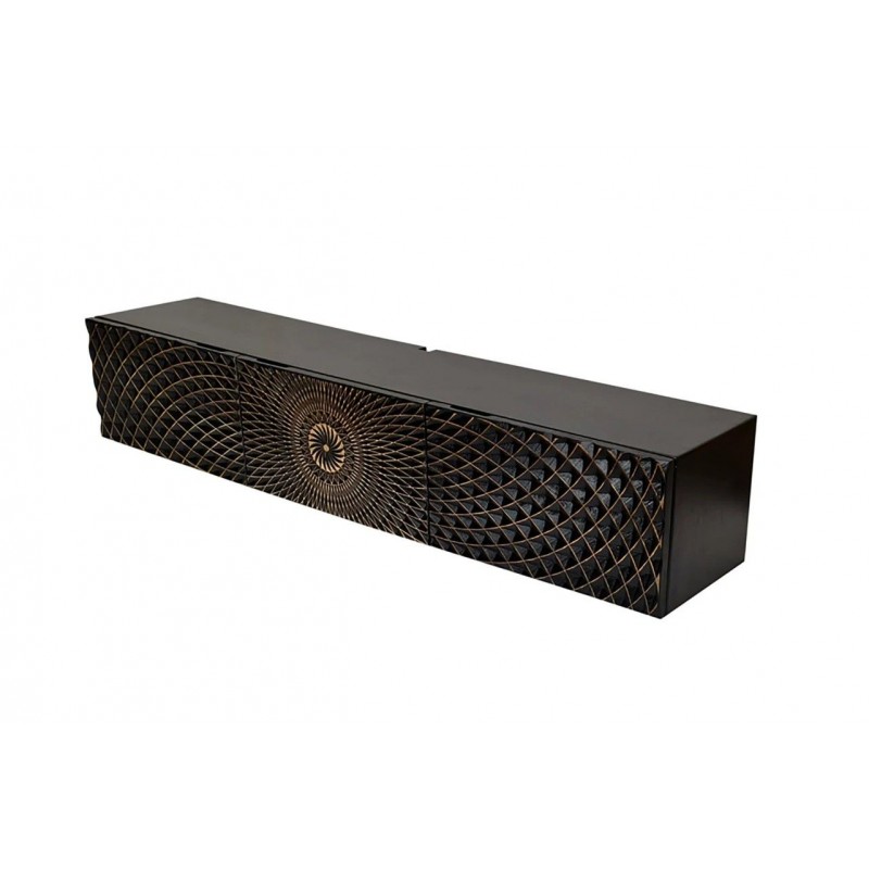 Ta prostokątna elegancka szafka RTV idealnie wpisze się nie tylko w industrialne, ale także minimalistyczne nowoczesne niewielkie wnętrze. Mebel ten wykonany został z litego drewna mango w czarnym odcieniu, którego front zdobi dekoracja optyczna z motywami mandali i naturalnymi przetarciami. Najbardziej wyróżniającym się elementem są zdobione drzwiczki z trójwymiarowym efektem 3D, które przyciągają wzrok i dodają meblowi niepowtarzalnego charakteru. To detale, które czynią szafkę nie tylko praktycznym miejscem na przechowywanie sprzętu elektrycznego oraz innych akcesoriów, ale również ozdobą, która może stać się centralnym punktem salonu. Z łatwością dostosujesz ją do swoich potrzeb, a jej ścienne mocowanie pozwala zaoszczędzić miejsce na podłodze, dzięki czemu jest niezwykle praktyczna. Dzięki niesamowitemu połączeniu nowoczesnej formy i naturalnych materiałów szafka RTV ILLUSION wprowadza do wnętrza styl i ciepło. Bez wątpienia to idealny wybór dla tych, którzy cenią zarówno estetykę, jak i trwałość, tworząc wnętrze o wyjątkowym charakterze.