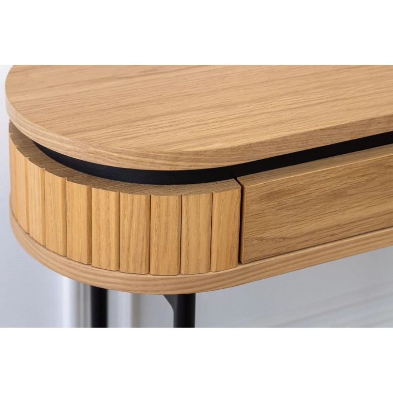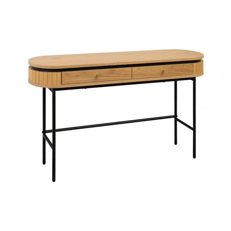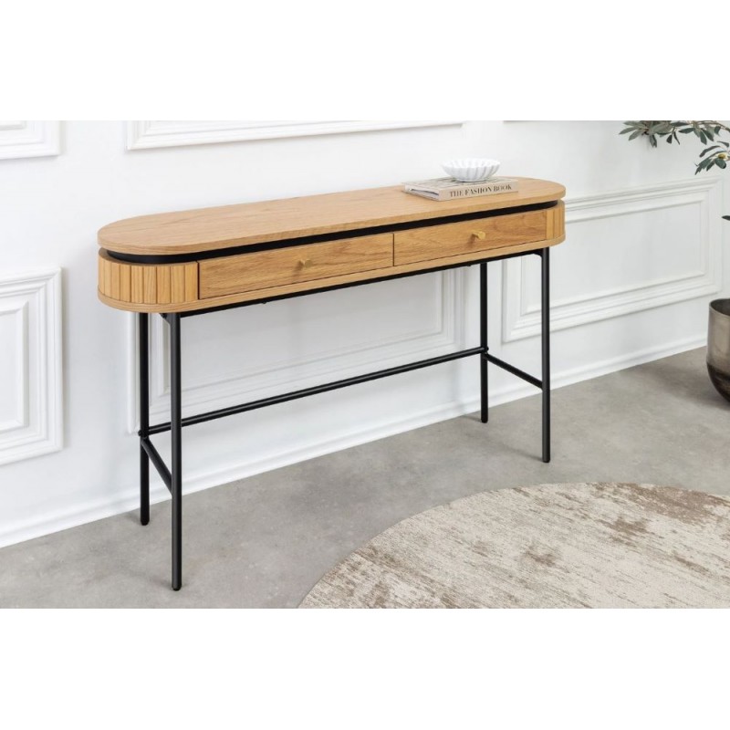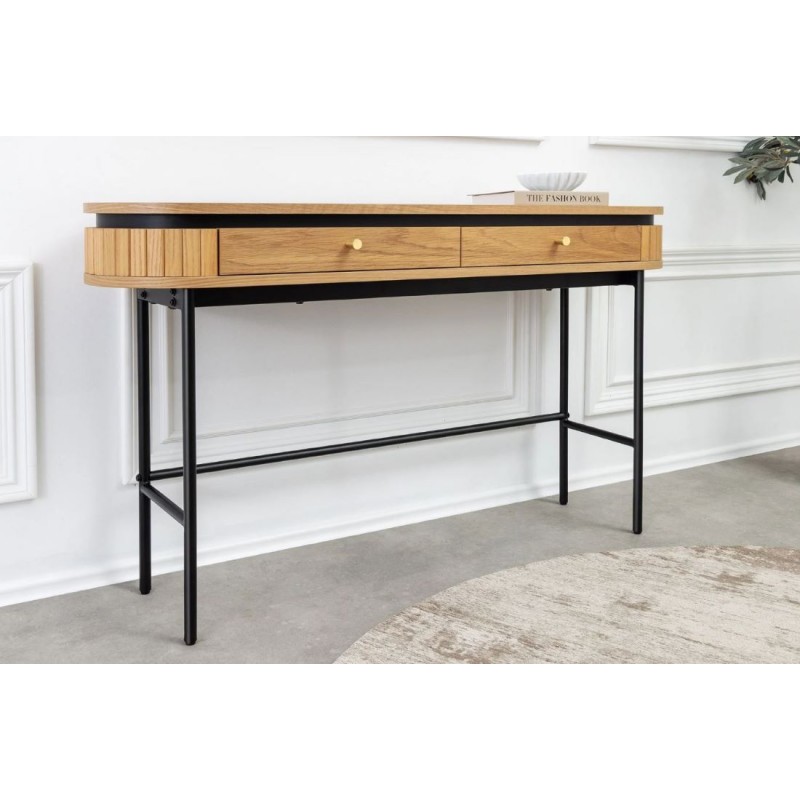 ATELIER to wyjątkowa propozycja dla tych, którzy cenią połączenie stylowego designu z nowoczesną elegancją. Konsola to idealne rozwiązanie do salonu, które doda naturalności oraz spokoju, a dzięki swojej wyjątkowej formie przykuje uwagę każdego. Wykonana została z płyty MDF oklejonej imitacją dębu oraz osadzona na stabilnej czarnej metalowej podstawie. Dzięki swojej smukłej linii całość wspaniale komponuje się z podstawą utrzymaną w ciemnej tonacji. Mebel ten jest bardzo pojemny, posiada dwie szerokie szuflady, które pomieszczą rzeczy codziennego użytku np: książki, dokumenty oferując tym samym dużą powierzchnię do przechowywania. Jej zaletą jest funkcjonalność, wytrzymałość oraz łatwość czyszczenia, wyróżnia się swoją wyrazistością, kolorem i strukturą powodując, że każdy egzemplarz jest unikatowy. Fronty lamelowe w imitacji dębu ze strukturą drewna nadają mu cennego i naturalnego wyrazu. Ponadto wykonany jest niewątpliwie z dużą precyzją, dzięki zachowaniu i odwzorcowaniu naturalnej oryginalności zarówno słojów jak i sęków. Bez wątpienia konsola ta sprawdzi się znakomicie w każdym nowoczesnym salonie, gdzie stanie się nie tylko funkcjonalnym meblem, ale także przepiękną dekoracją, dzięki której pomieszczenie nabierze naturalnego ciepła oraz niesamowitego stylu.