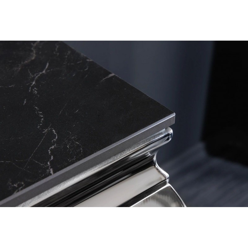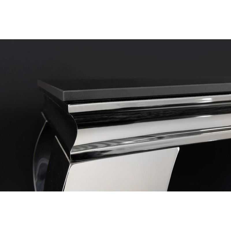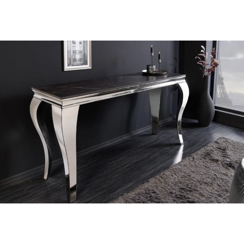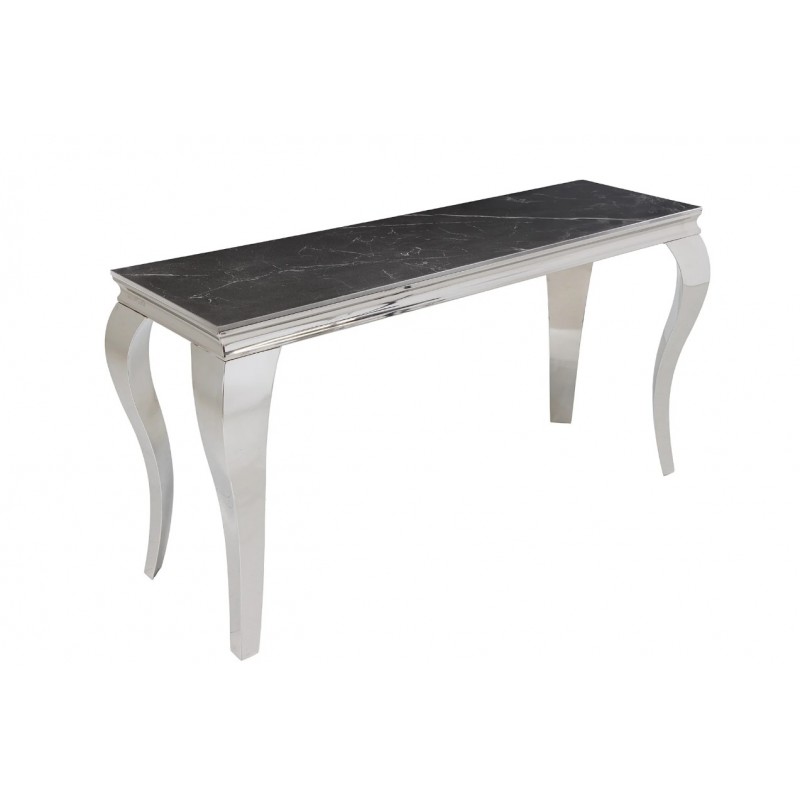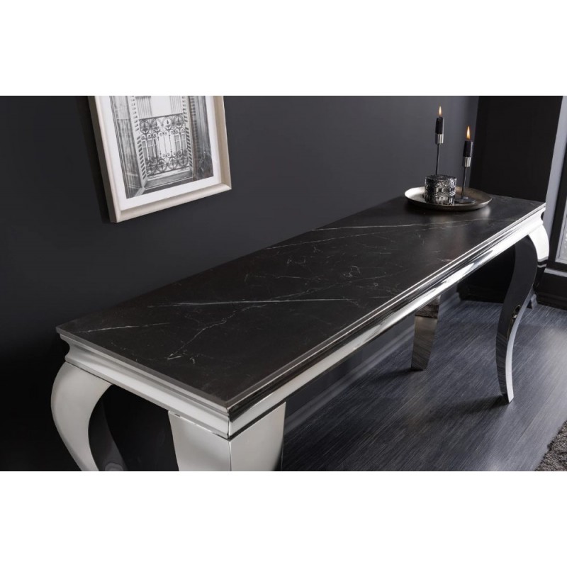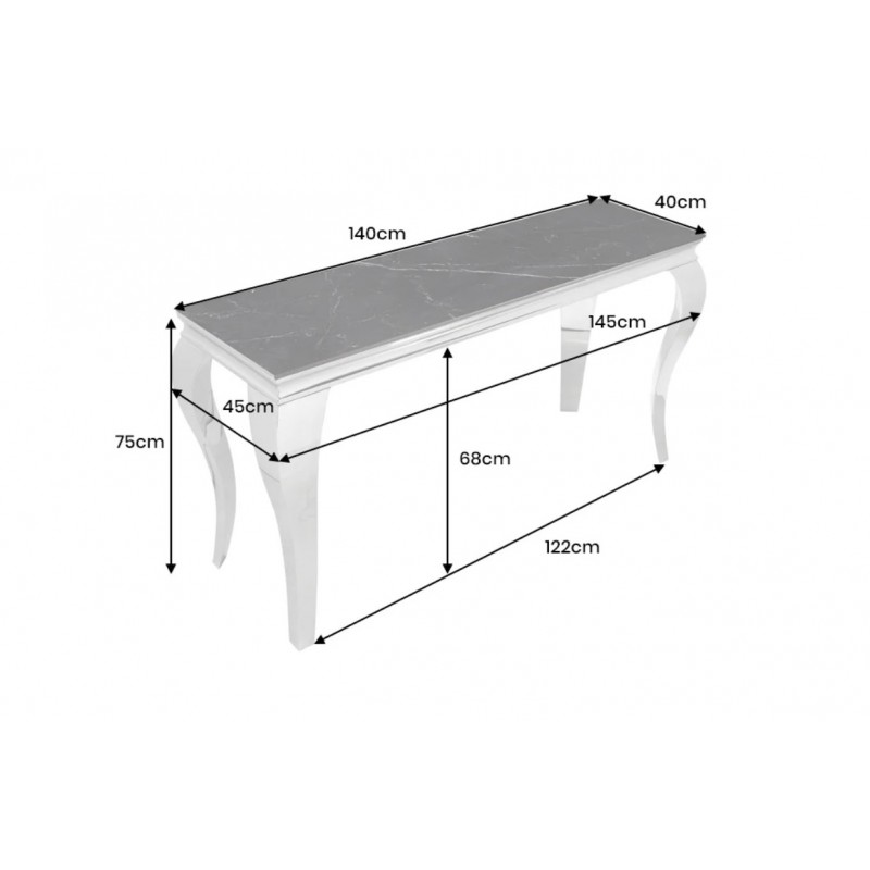 Nowoczesna konsola MODERN BAROCK, która została osadzona na stabilnej prostokątnej stalowej konstrukcji w kolorze srebrnego chromu. Jej najbardziej przyciągającym uwagę elementem jest prostokątny blat o grubości 1,0 cm, wykonany ze spieku kamiennego wyglądem przypominającego marmur, którego kolorystykę przełamano charakterystycznymi delikatnymi nitkami w różnych w odcieniach szarości i bieli. Mebel ten perfekcyjnie odzwierciedla styl nowoczesny oraz barokowy, a jego szlachetne wzornictwo sprawi, że twój salon uzyska trochę luksusu oraz niezwykłej i niepowtarzalnej charyzmy. Konsola MODERN BAROCK sprawdzi się znakomicie w każdym salonie czy jadalni, gdzie dzięki swoim wymiarom oraz palecie barw nada wnętrzu charakteru oraz niezwykłej elegancji.