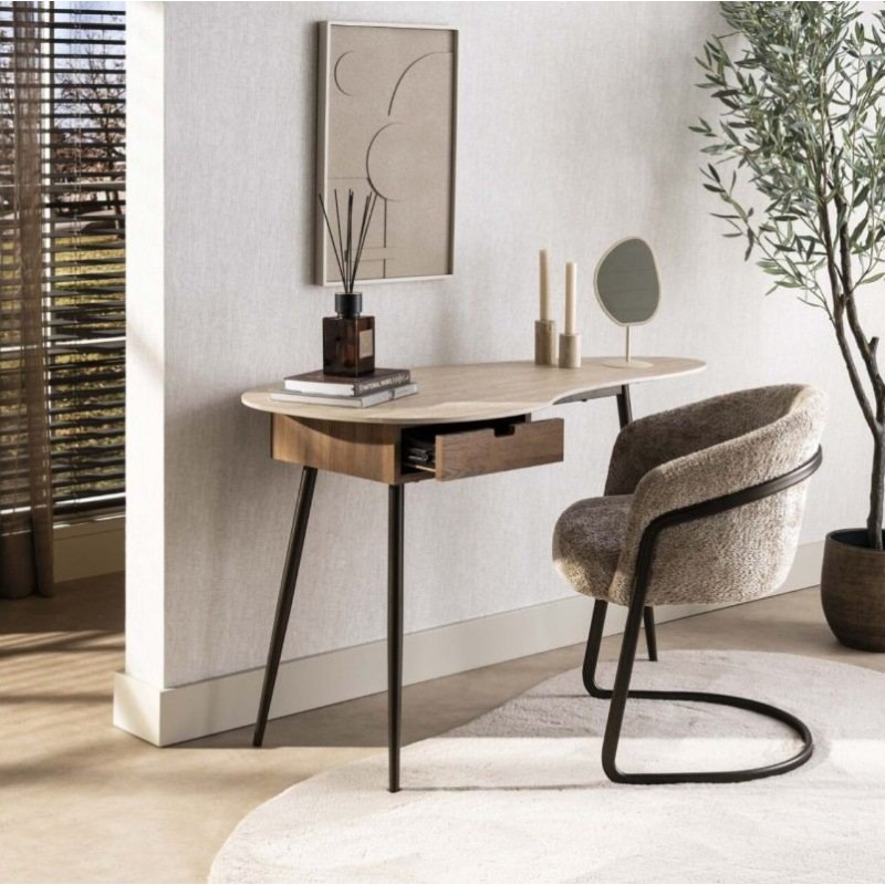 Konsola MORAJ to interesujący minimalistyczny mebel, który dzięki swojej prostej formie przykuje uwagę każdego oraz doda pomieszczeniu, w którym się znajduje ciepła i spokoju. Stabilna, smukła metalowa podstawa w kolorze brązu nadaje jej niebywałej lekkości. Duży owalny, asymetryczny ceramiczny blat w beżowej tonacji przyciąga uwagę swoją wyrazistością, bez wątpienia stanowiąc wyraźny akcent wizualny mebla. Jego niepowtarzalny charakter podkreśla dekor inspirowany naturalnym kamieniem o strukturze trawertynu uzupełniony elegancką, kolorystyką w odcieniach beżu. Pod blatem z lewej strony znajduje się praktyczna, funkcjonalna i pojemna szuflada, która bez problemu pomieści najpotrzebniejsze przedmioty codziennego użytku. Została wykonana z płyty MDF z drewnianym dekorem imitującym naturalny dąb, który dzięki zachowaniu oryginalnej struktury drewna w postaci sęków i słojów doskonale uwydatnia jej naturalność. Zaletą mebla jest funkcjonalność, wytrzymałość oraz łatwość czyszczenia, wyróżniając się wyrazistością, kolorem i strukturą powodują jednocześnie, że każdy egzemplarz jest unikatowy. Efekt końcowy połączenia ceramiki oraz metalowej brązowej podstawy jest fenomenalny sprawiając tym samym, że konsola ta nie zajmuje dużo miejsca, więc stanowi prosty i praktyczny dodatek, który znacznie ułatwi nam życie codzienne. Sprawdzi się idealnie w każdym salonie i sypialni urządzonych w stylu nowoczesnym gdzie bez wątpienia przykuje uwagę każdego dodając tym samym przestrzeni niesamowitego charakteru.