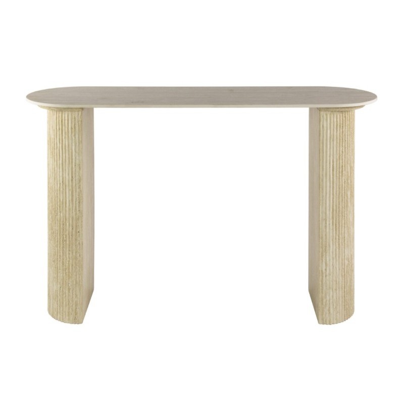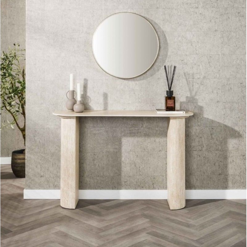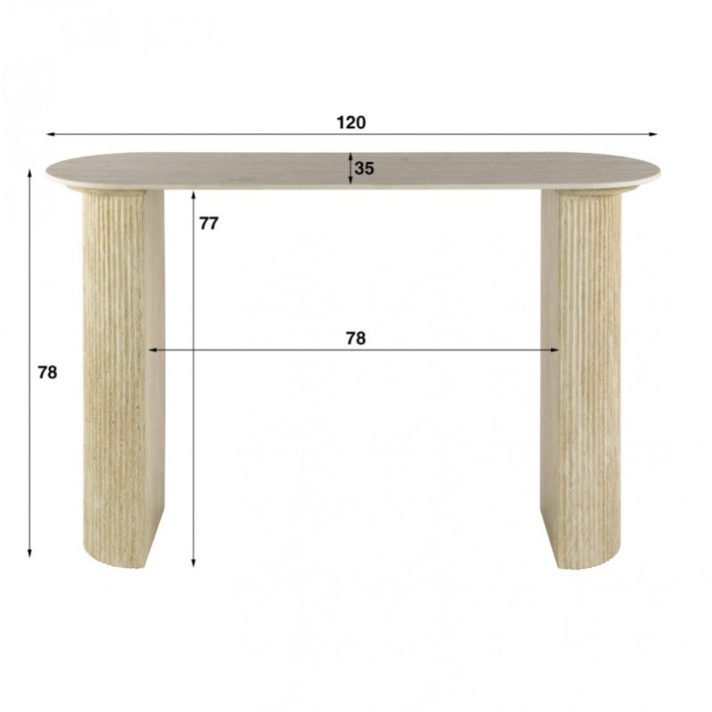Konsola TIAGO to idealne rozwiązanie do każdego salonu urządzonego stylu nowoczesnym, który doda naturalności i spokoju, a także dzięki swojej formie przykuje uwagę każdego. Blat wykonany został z ceramiki w kolorze beżowym, którego struktura podkreśla wyjątkowość mebla. Wyróżnia się między innymi wyrazistym charakterem, podkreślonym dekoracją w formie kamienia naturalnego o wyglądzie trawertynu, którego elegancką kolorystyką dopełniają różne odcienie beżu. Głównym jej atutem bez wątpienia jest geometryczna forma dużego owalnego blatu, osadzonego na solidnej, stabilnej podstawie w formie dwóch kolumn z płyty MDF w kształcie półksiężyca, które zdobi pionowa dekoracja falista. Zaletą jej jest również, praktyczność, funkcjonalność, wytrzymałość oraz łatwość czyszczenia, przez co wyróżnia się swoim kolorem i strukturą powodując, że każdy egzemplarz jest unikatowy. Efekt końcowy wykończenia całości w jasnych kolorach beżu jest jednolity sprawiając tym samym, że konsola TIAGO nie zajmuje dużo miejsca, więc stanowi prosty i praktyczny dodatek, który znacznie ułatwi nam życie codzienne. Sprawdzi się idealnie w każdym salonie i sypialni urządzonych w stylu nowoczesnym gdzie bez wątpienia przykuje uwagę każdego dodając tym samym przestrzeni niesamowitego charakteru.