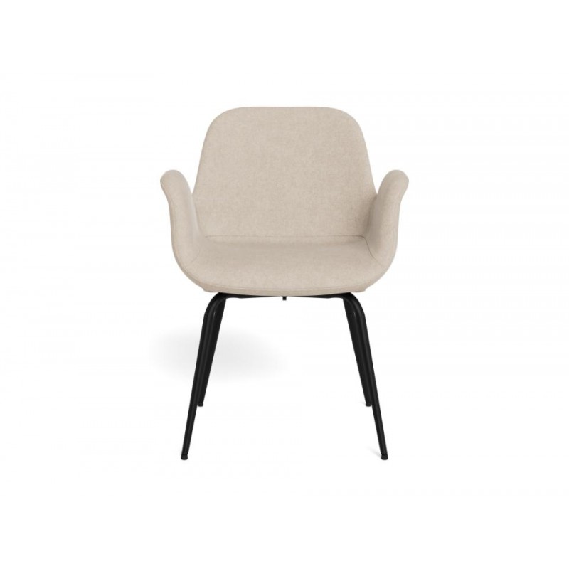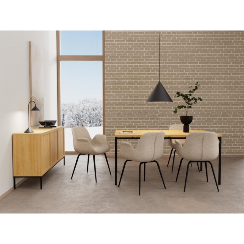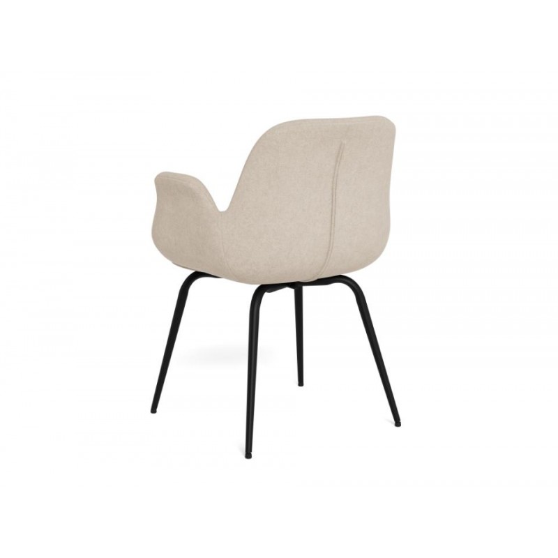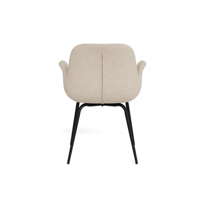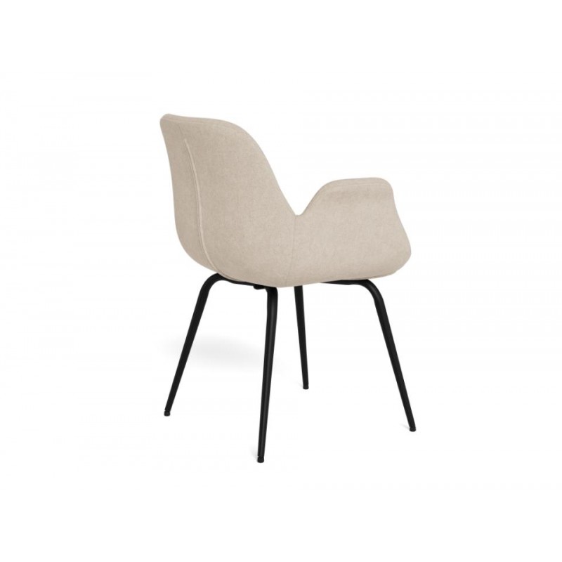To krzesło do jadalni z podłokietnikami wyróżnia się elegancką formą i nowoczesnym designem. Subtelnie zaokrąglone linie oraz miękka, jasnoszara tapicerka nadają mu przytulny, a zarazem wyrafinowany charakter. Smukłe siedzisko osadzone zostało na okrągłych nogach z czarnej, malowanej proszkowo stali, co zapewnia stabilność i harmonijnie komponuje się z różnymi stylami wnętrz. Krzesło doskonale łączy estetykę z komfortem, stanowiąc ponadczasowy element każdej jadalni.