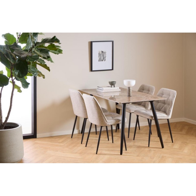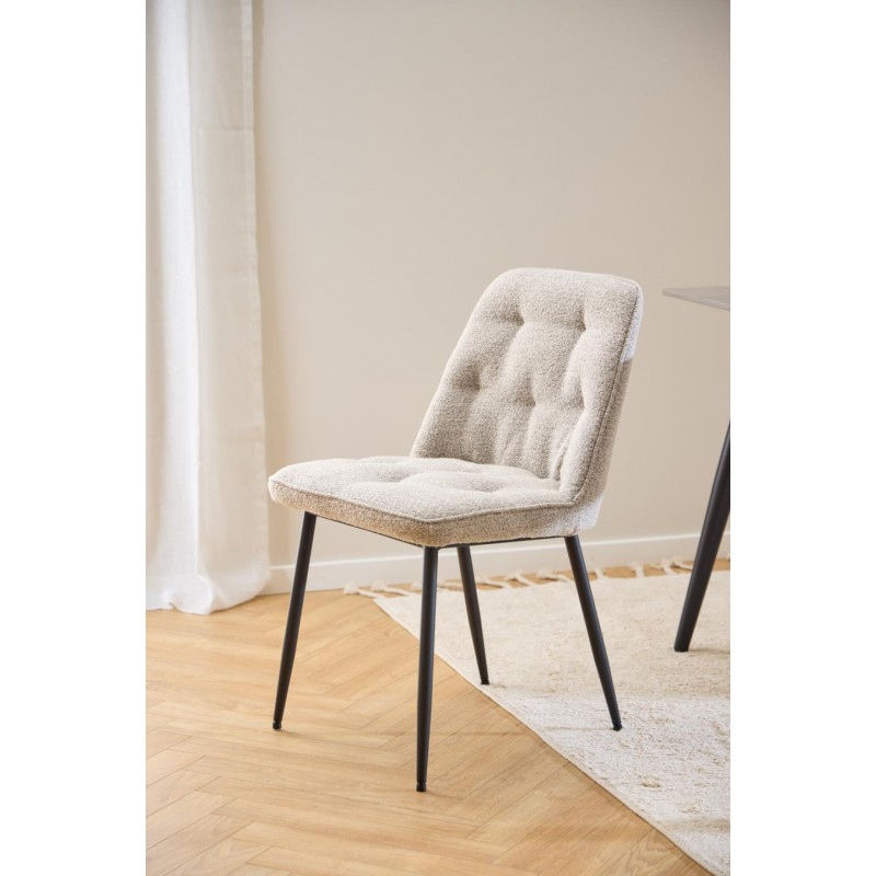 Krzesło Brooke to propozycja dla tych, którzy chcą nadać swojemu wnętrzu trochę luksusu. Mebel ten wyróżnia się przede wszystkim swoją stylową elegancką formą odnajdującą się świetnie w nowoczesnych jadalniach oraz salonach. Wysokie siedzisko otapicerowane zostało miękką, tkaniną boucle w beżowym kolorze, którego dodatkowym atutem bez wątpienia są stylowe pikowania podkreślają jego wyjątkowy charakter. Komfort użytkowania na długi czas zapewniają wyprofilowane oparcie oraz siedzisko wspierając odpowiednio sylwetkę siedzącego podczas jego użytkowania. Stabilną metalową czarną podstawę stanowią smukłe nogi, które dopełniają w całości jego wyjątkowy wygląd. Krzesło to stworzone zostało głównie z myślą o użytkownikach ceniących sobie funkcjonalność oraz stylowe wykończenie. Efekt końcowy połączenia beżowego koloru siedziska oraz metalowej ciemnej podstawy jest fenomenalny, dzięki czemu idealnie odnajdzie się w stylu klasycznym oraz nowoczesnym. Krzesło Brooke doskonale uzupełni Twoje przestronne wnętrze pozwalając się cieszyć relaksem każdego dnia.