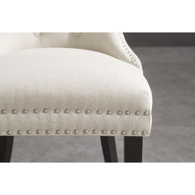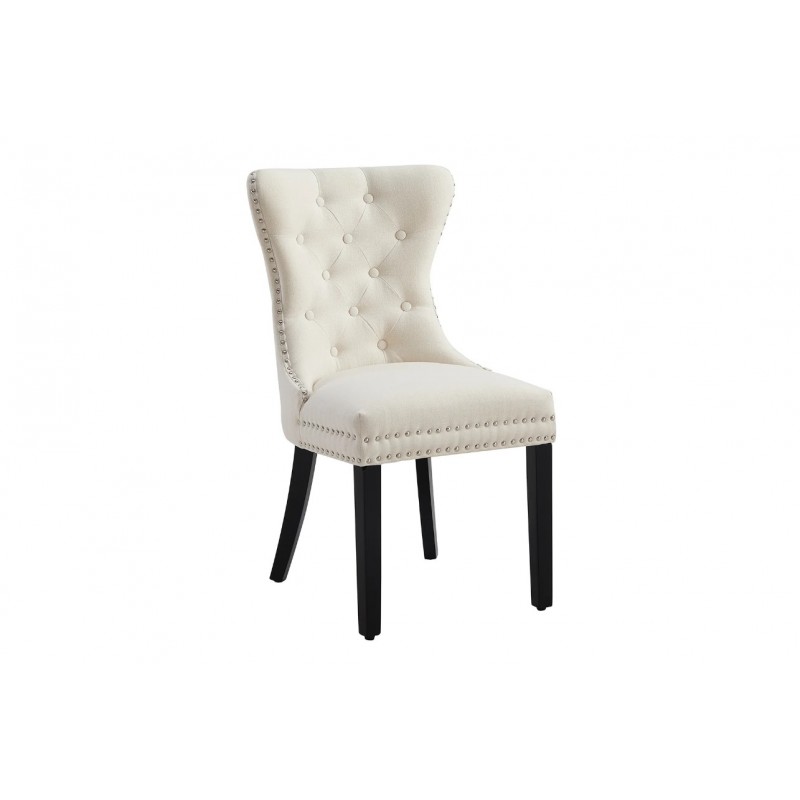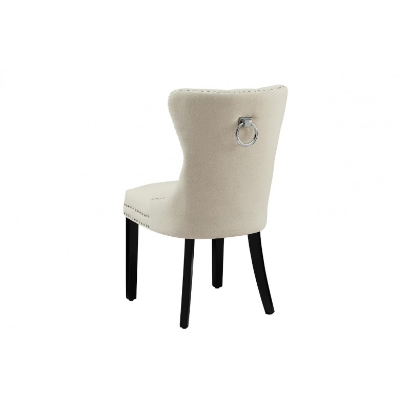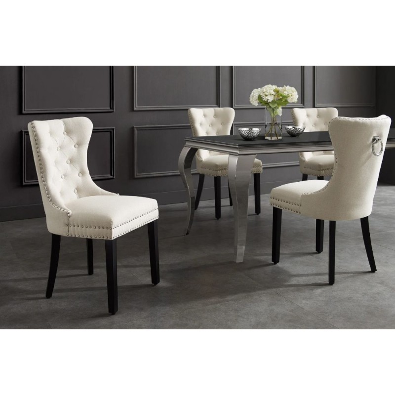 Krzesło Castle to mebel, którego tapicerowane siedzisko zostało postawione na nogach wykonanych z drewna kauczukowego w kolorze czarnym. Siedzisko obito modną plecioną tkaniną w kolorze beżowym z pięknym stylowym wykończeniem, jego wnętrze zdobią pikowania z guzikami, natomiast na zewnątrz zastosowano dekoracyjną srebrną kołatkę. Bez wątpienia kształt siedziska gwarantuję wygodę, a wyprofilowane oparcie odpowiednio wspiera sylwetkę siedzącego podczas jego użytkowania. Ponadto oryginalne krzywizny, zdobienia, wygodne siedzisko oraz smukła czarna drewniana podstawa nadają mu wyjątkowy design. Krzesło to stworzone zostało głównie z myślą o użytkownikach ceniących sobie funkcjonalność oraz stylowe wykończenie. Charakterystyczną jego cechą jest tkanina, która zwiększa komfort użytkowania sprawiając, że wygląda bardzo elegancko, idealnie komponując się do nowoczesnego wnętrza w stylu barokowym.