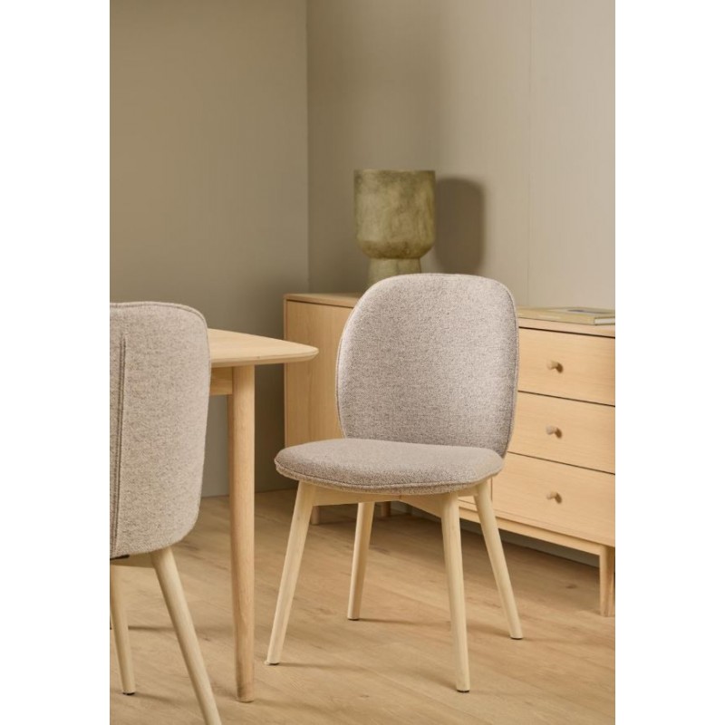 Krzesło CINDY łączy komfort, nowoczesną elegancję i ponadczasowy styl. Jego wyjątkowa forma doskonale podkreśla styl nowoczesnych przestrzeni jadalnianych. Wykonane z wysokiej jakości materiałów, zachwyca wyglądem i dodaje wnętrzu wyjątkowego charakteru. Zaokrąglone oparcie zapewnia wygodę podczas jego użytkowania, a miękka tapicerka z tkaniny przypominającej bouclé w beżowym odcieniu nadaje mu zarazem przyjemną w dotyku fakturę oraz współczesny wgląd. Całość dopełniają drewniane bielone olejowane nogi, które wprowadzają naturalny i ciepły akcent. Bez wątpienia to idealny wybór dla osób ceniących funkcjonalność, wygodę i stylowe detale.