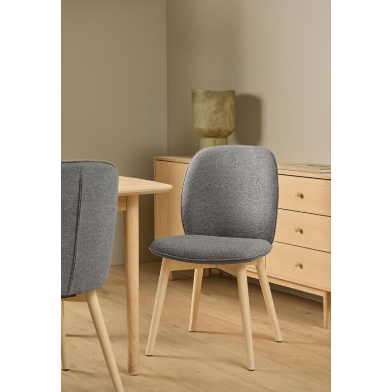 Krzesło CINDY łączy komfort, nowoczesną elegancję i ponadczasowy styl. Jego wyjątkowa forma doskonale podkreśla styl nowoczesnych przestrzeni jadalnianych. Wykonane z wysokiej jakości materiałów, zachwyca wyglądem i dodaje wnętrzu wyjątkowego charakteru. Zaokrąglone oparcie zapewnia wygodę podczas jego użytkowania, a miękka tapicerka z tkaniny przypominającej bouclé w szarym odcieniu nadaje mu zarazem przyjemną w dotyku fakturę oraz współczesny wgląd. Całość dopełniają drewniane bielone olejowane nogi, które wprowadzają naturalny i ciepły akcent. Bez wątpienia to idealny wybór dla osób ceniących funkcjonalność, wygodę i stylowe detale.