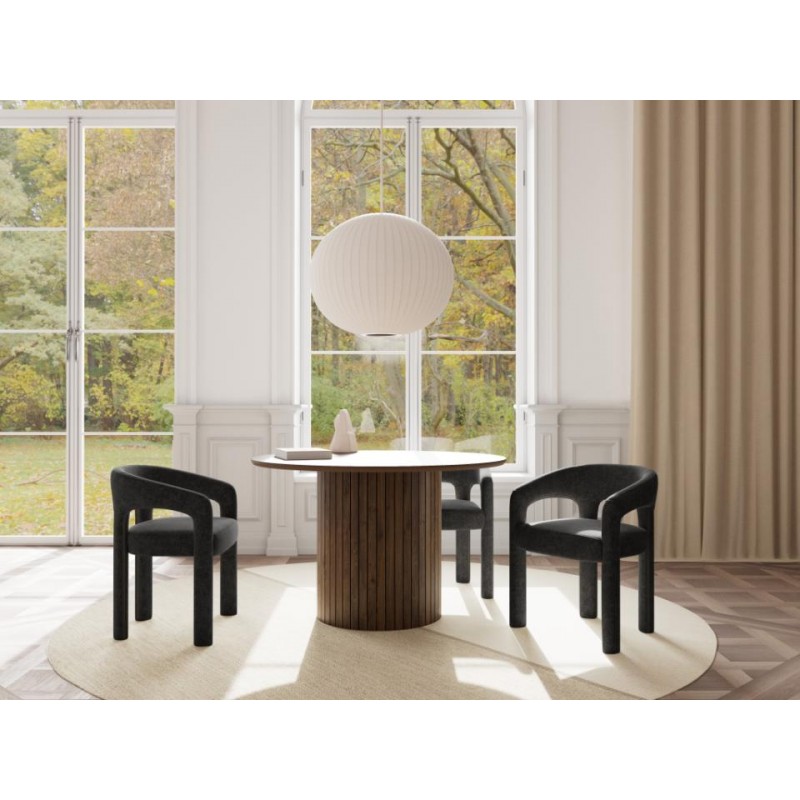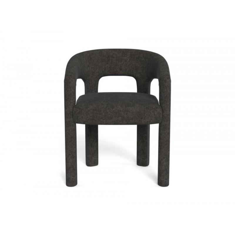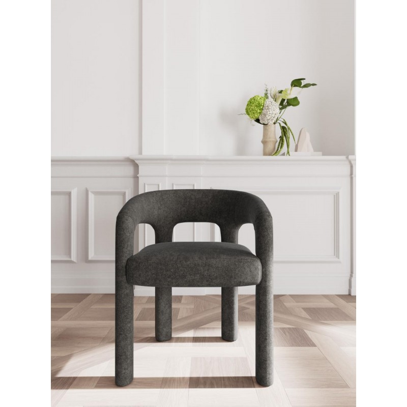 To krzesło jadalniane w ciemnoszarym kolorze łączy w sobie elegancję i wyjątkowy komfort użytkowania. Wyposażone w podłokietniki oraz tapicerowane nowoczesną tkaniną z przędzy szenilowej, zachwyca miękką fakturą i przyjemnym w dotyku wykończeniem. Zastosowanie sprężyn kieszeniowych w siedzisku zapewnia wysoki komfort siedzenia i doskonałe podparcie, nawet podczas dłuższych spotkań przy stole. Uniwersalna forma i stonowana kolorystyka sprawiają, że krzesło z łatwością dopasuje się do każdego stołu i aranżacji jadalni, dodając jej wyrafinowanego charakteru.