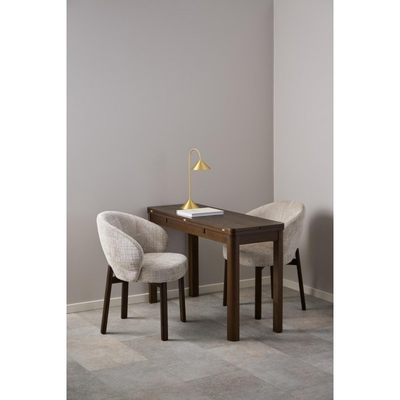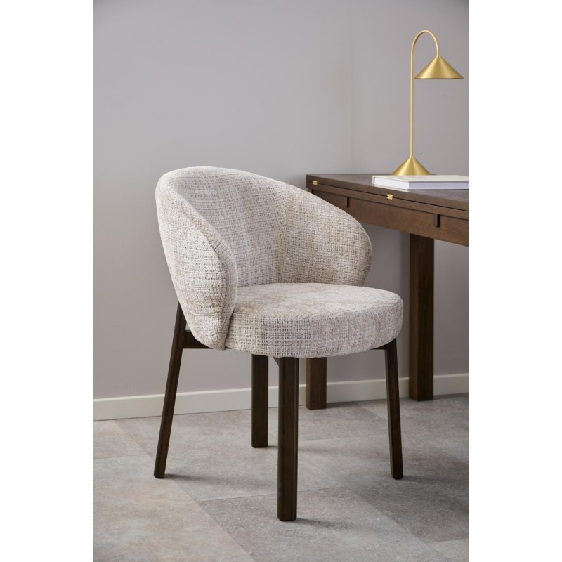 Krzesło do jadalni Darlene z podłokietnikiem, tkanina Juto beżowa 4 FR, podstawa matowa, lakierowany dąb dymiony z przeszyciami i sprężynami kieszeniowymi. To krzesło do jadalni z podłokietnikami odzwierciedla nowoczesny design. Jego gładkie, zaokrąglone siedzisko jest otapicerowane beżową tkaniną o teksturowanej powierzchni. Krzesło ze sprężynami kieszeniowymi zapewnia doskonały komfort siedzenia. W połączeniu z okrągłymi nogami z dębu przydymionego wykończonymi lakierem, ten projekt emanuje ciepłem i wyrafinowaniem.