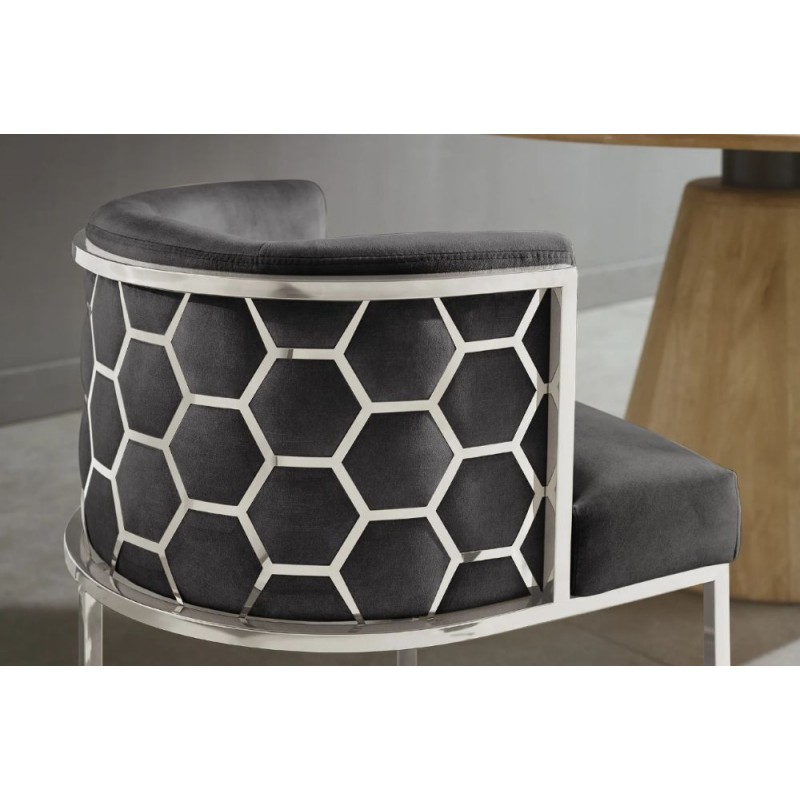 Eleganckie krzesło ELEGANCE to bez wątpienia połączenie komfortu, nowoczesnego designu i wysokiej jakości wykonania. Siedzisko otapicerowano modną aksamitną tkaniną w kolorze szarym, które zostało osadzone na stabilnej podstawie ze stali nierdzewnej, gwarantując tym samym trwałość i solidność. Kształt mebla zapewnia wyjątkową wygodę, a wyprofilowane oparcie odpowiednio wspiera sylwetkę podczas jego użytkowania. Złota metalowa konstrukcja nie tylko podkreśla jego wyjątkowość, ale dzięki geometrycznym detalom wokół siedziska wyróżnia jego design, a oryginalne krzywizny i subtelne zdobienia nadają mu niepowtarzalnego charakteru. Krzesło ELEGANCE zostało stworzone z myślą o osobach ceniących funkcjonalność oraz luksusowe, stylowe wykończenie wnętrz. Charakterystyczną cechą mebla jest aksamitna tkanina, która w połączeniu ze srebrną podstawą podkreśla jego stylowy wygląd idealnie komponując się z nowoczesnymi wnętrzami w stylu glamour.