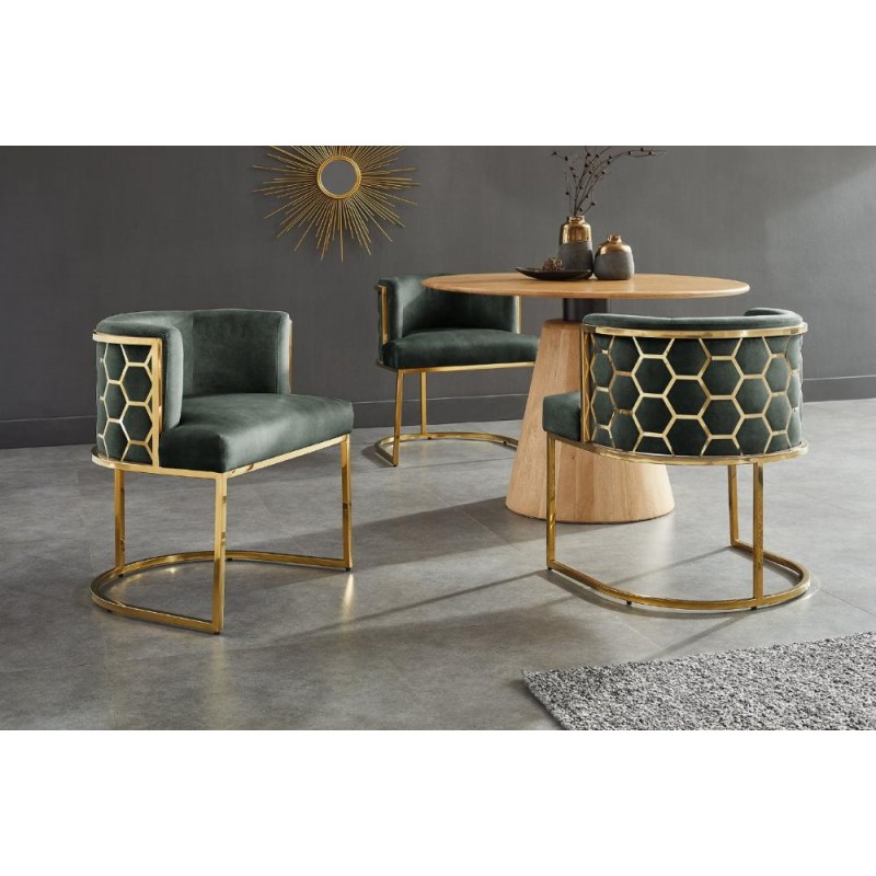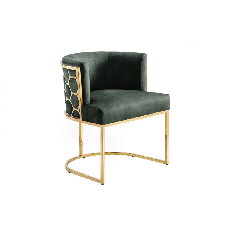 Eleganckie krzesło ELEGANCE to bez wątpienia połączenie komfortu, nowoczesnego designu i wysokiej jakości wykonania. Siedzisko otapicerowano modną aksamitną tkaniną w kolorze zielonym, które zostało osadzone na stabilnej podstawie ze stali nierdzewnej, gwarantując tym samym trwałość i solidność. Kształt mebla zapewnia wyjątkową wygodę, a wyprofilowane oparcie odpowiednio wspiera sylwetkę podczas jego użytkowania. Złota metalowa konstrukcja nie tylko podkreśla jego wyjątkowość, ale dzięki geometrycznym detalom wokół siedziska wyróżnia jego design, a oryginalne krzywizny i subtelne zdobienia nadają mu niepowtarzalnego charakteru. Krzesło ELEGANCE zostało stworzone z myślą o osobach ceniących funkcjonalność oraz luksusowe, stylowe wykończenie wnętrz. Charakterystyczną cechą mebla jest aksamitna tkanina, która w połączeniu ze złotą podstawą podkreśla jego stylowy wygląd idealnie komponując się z nowoczesnymi wnętrzami w stylu glamour.