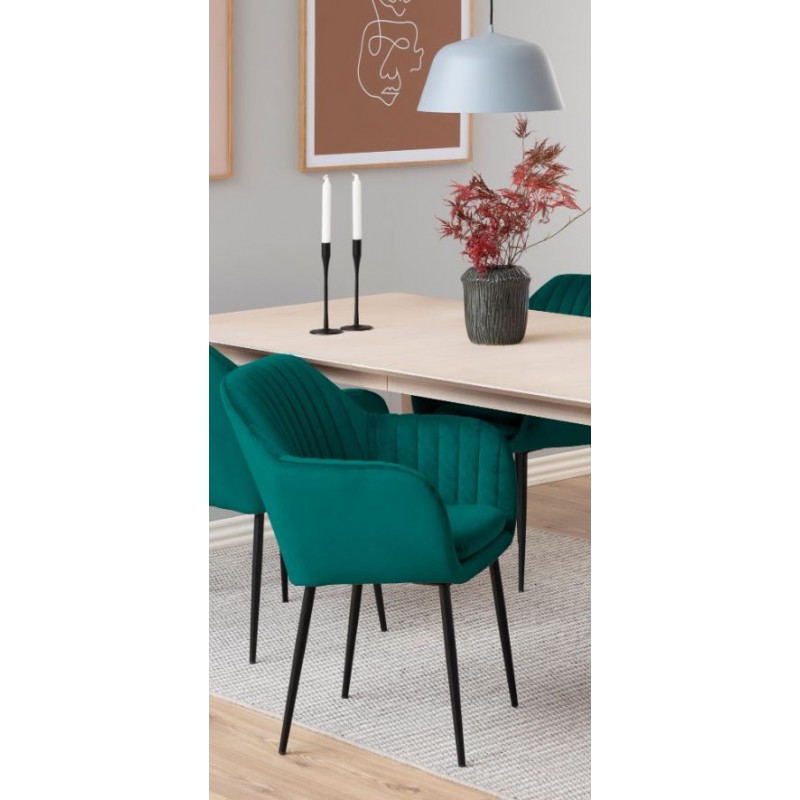 Wysoka jakość materiałów z których to krzesło kuchenne zostało wykonane oraz wyprofilowane oparcie, gwarantują wygodne miejsce do siedzenia i stylowy element wyposażenia nowoczesnego wnętrza na długie lata. Niezwykle komfortowe i eleganckie krzesło kuchenne, wykonane zostało z welurowej tkaniny w kolorze turkusowym oraz metalowej podstawy. Ta welurowa tkanina w połączeniu z pionowymi przeszyciami na oparciu oraz czarnymi nogami, prezentuje się bardzo elegancko i nowocześnie, a ponadto jest łatwa w utrzymaniu czystości. Krzesło doskonale sprawdzi się zarówno w domowych kuchniach, salonach, jak również przestrzeniach biurowych.