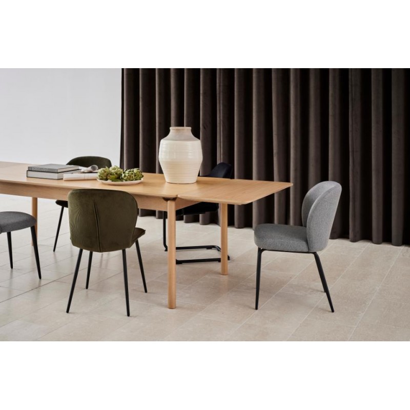 Krzesło w sztruksowej tkaninie z wyprofilowanym oparciem gwarantuje wygodne miejsce do siedzenia i stylowy element wyposażenia nowoczesnego wnętrza na długie lata. Niezwykle komfortowe krzesło do stołu kuchennego, wykonane zostało z zielonej tkaniny, która w połączeniu z czarnymi, metalowymi nogami prezentuje się bardzo elegancko i nowocześnie. Ponadto tkanina sztruksowa jest łatwa w utrzymaniu czystości i przyjemna w odczuciu. Krzesło doskonale sprawdzi się zarówno w domowych jadalniach, salonach, jak również przestrzeniach biurowych.