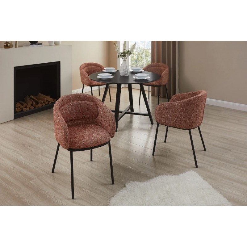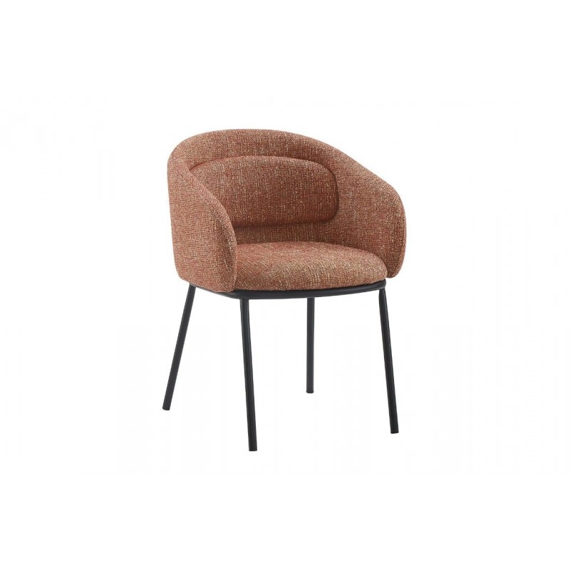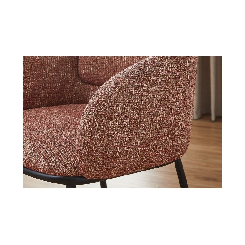 Krzesło FLORENZ to mebel, którego tapicerowane siedzisko zostało postawione na czarnej smukłej metalowej podstawie. Siedzisko obite zostało modną plecioną tkaniną w kolorze brązowym, którego wyjątkowy charakter podkreśla gramatura strukturalnej tapicerki. Bez wątpienia kubełkowy kształt siedziska gwarantuję wygodę, a wyprofilowane oparcie i podłokietniki odpowiednio wspierają sylwetkę siedzącego podczas jego użytkowania. Ponadto oryginalne krzywizny, zdobienia, wygodne siedzisko oraz metalowa podstawa nadają mu wyjątkowy design. Krzesło to stworzone zostało głównie z myślą o użytkownikach ceniących sobie funkcjonalność oraz stylowe wykończenie. Charakterystyczną jego cechą jest tkanina, która zwiększa komfort użytkowania sprawiając, że wygląda bardzo elegancko, idealnie komponując się do stylu nowoczesnego wnętrza.
