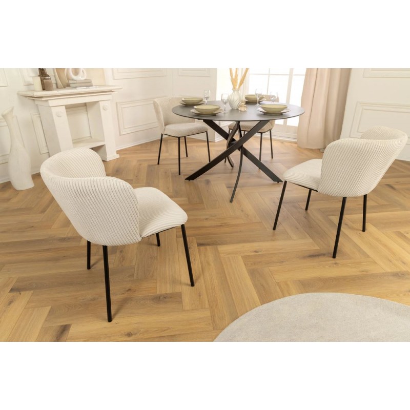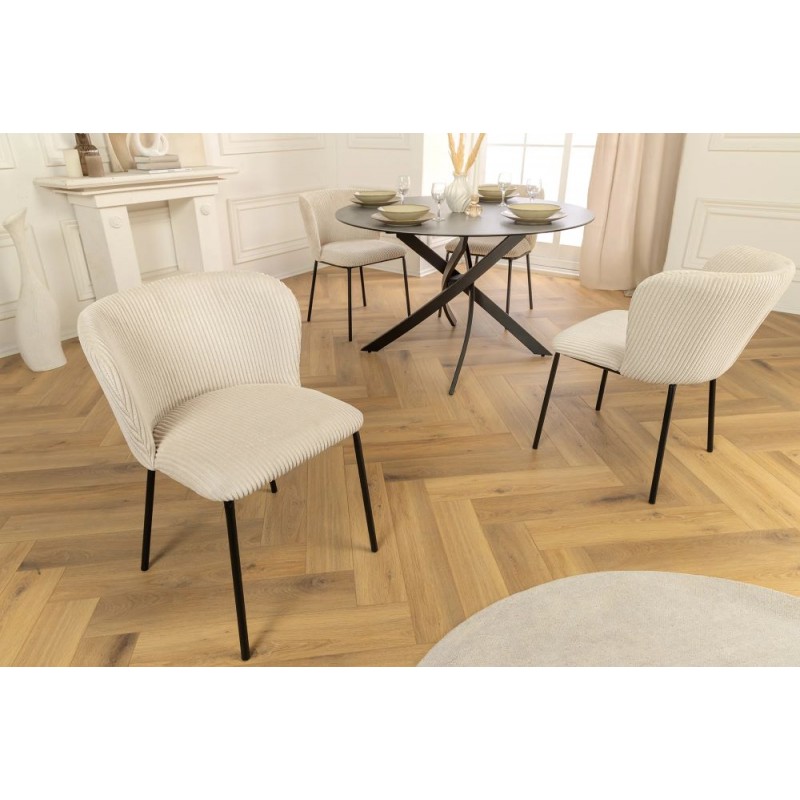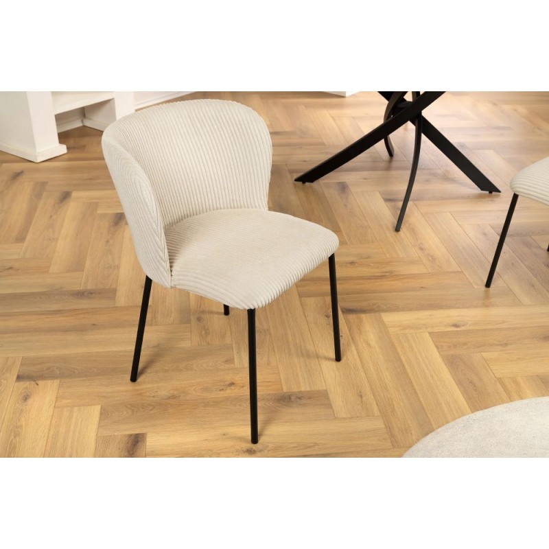 Krzesło LYON to propozycja dla tych, którzy chcą nadać swojemu wnętrzu trochę elegancji. Głównym elementem mebla jest jego wysokie zaokrąglone siedzisko obite modną sztruksową tkaniną w kolorze beżowym, którego wyjątkowy charakter bez wątpienia podkreśla gramatura prążkowanej tapicerki. Podstawa została wykonana z czterech smukłych stabilnych metalowych nóg w kolorze czarnym, które idealnie komponują się z korpusem mebla sprawiając, że całość prezentuje się zjawiskowo. Dodatkowym jego atutem bez wątpienia jest zastosowana dekoracyjna sztruksowa tkanina wewnątrz siedziska, która podkreśla jego wyjątkowość. Krzesło to stworzone zostało przede wszystkim z myślą o użytkownikach ceniących sobie funkcjonalność oraz stylowe wykończenie. Mebel ten znakomicie uzupełni każde przestronne wnętrze pozwalając się cieszyć relaksem każdego dnia. Niezwykły komfort krzesła zapewnia odpowiednio wyprofilowane oparcie, które wspiera sylwetkę siedzącego podczas jego użytkowania. LYON sprawdzi się idealnie w każdym salonie oraz jadalni urządzonej w stylu nowoczesnym oraz retro dodając przestrzeni niezwykle oryginalnego charakteru.